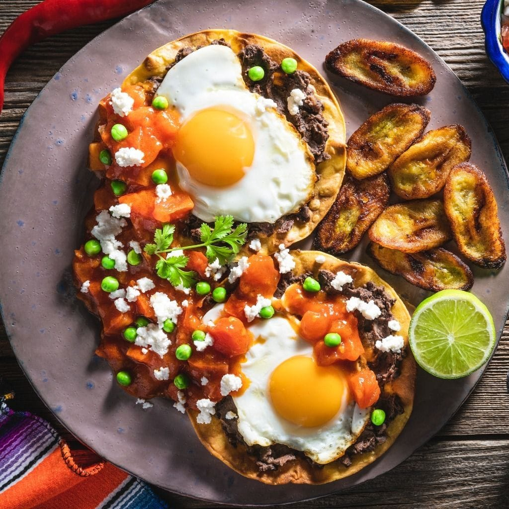 Huevos motuleños, acompañados de salsa roja y platanitos fritos.