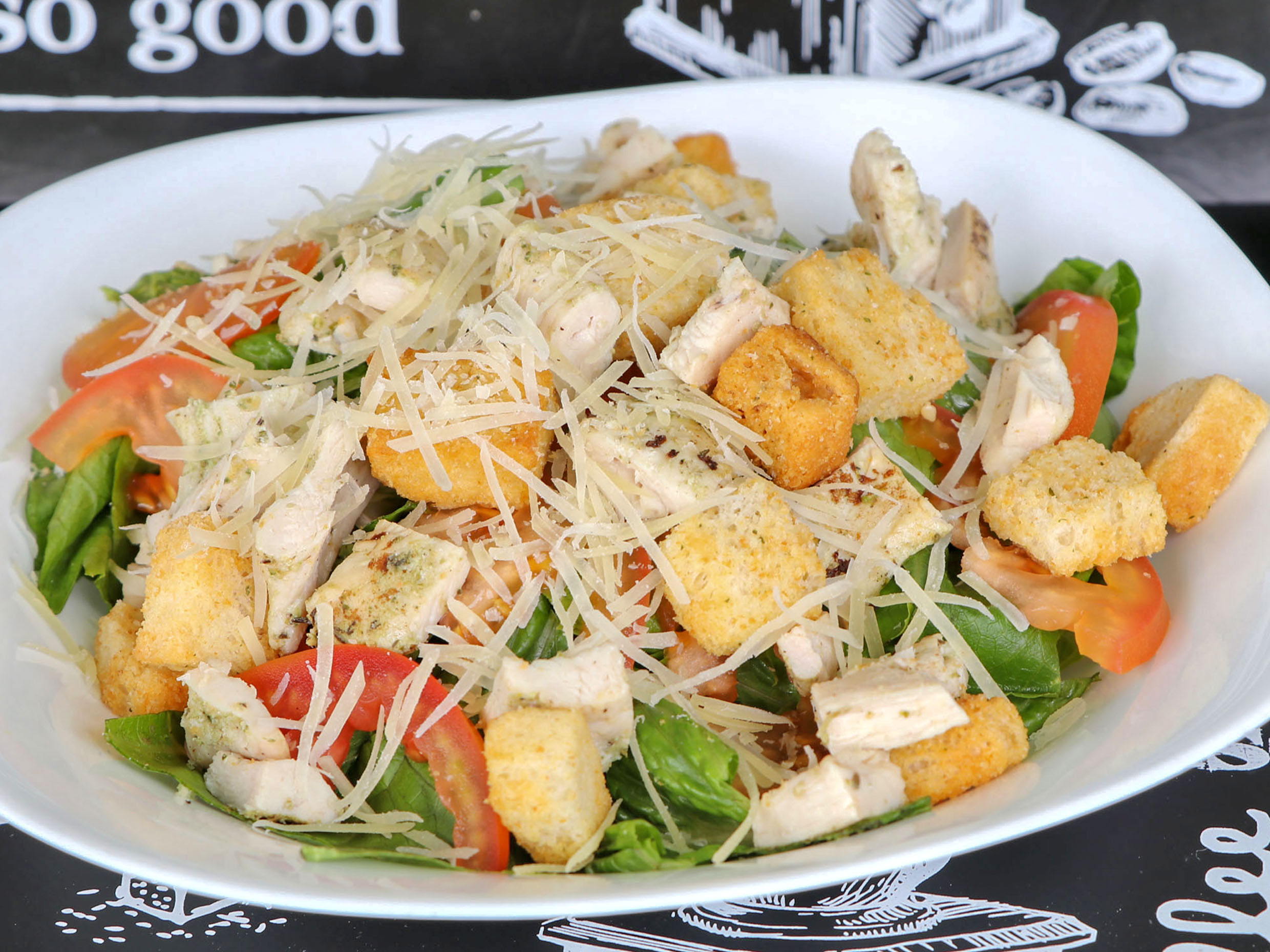 Lechuga larga, acompañada de crotones, queso parmesano, tómate, pechuga de pollo a la plancha y aderezo cesar