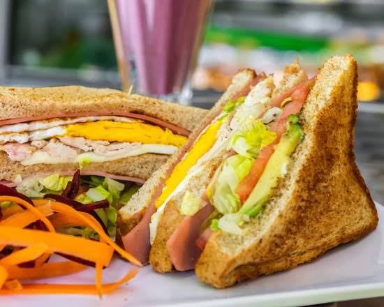 club sandwich con papas fritas +´bebida del dia + galleta o yogurth.