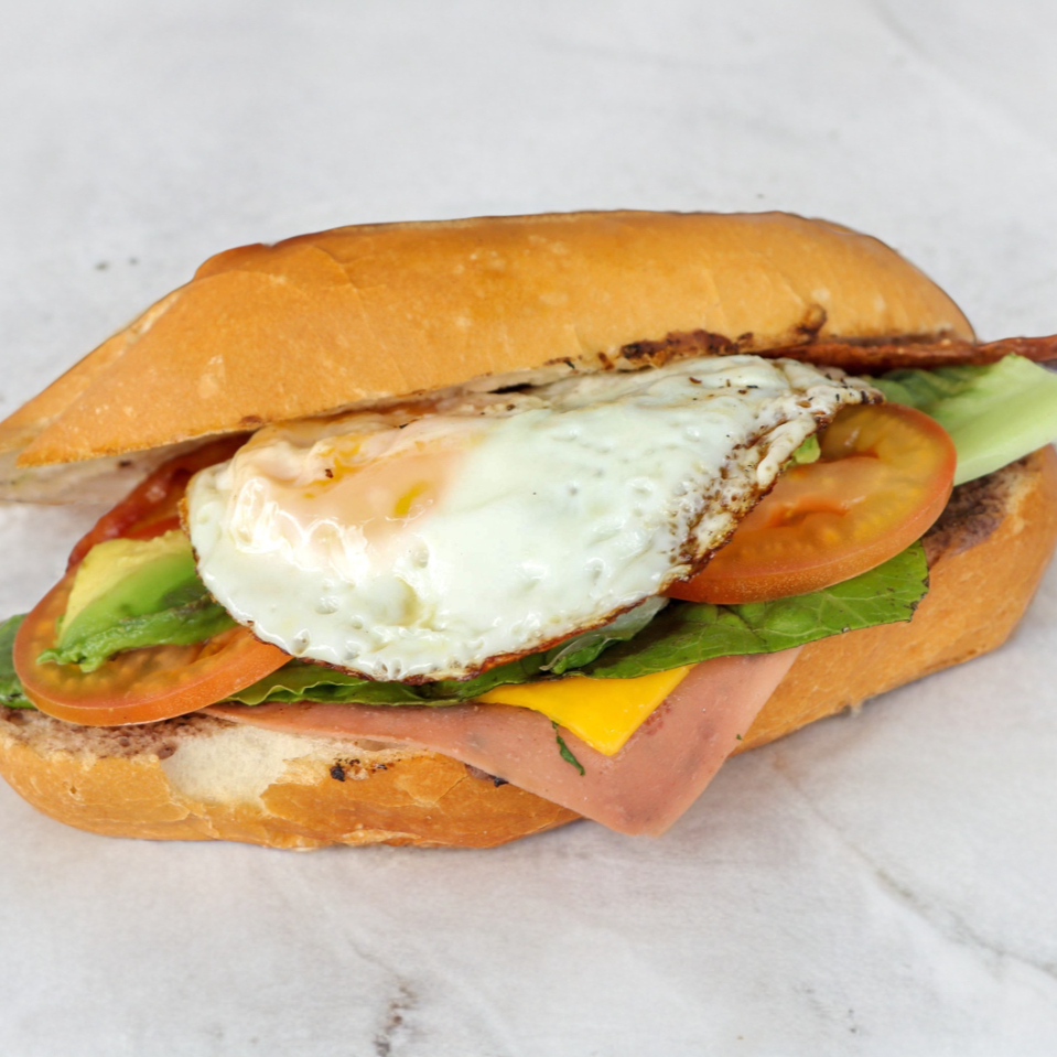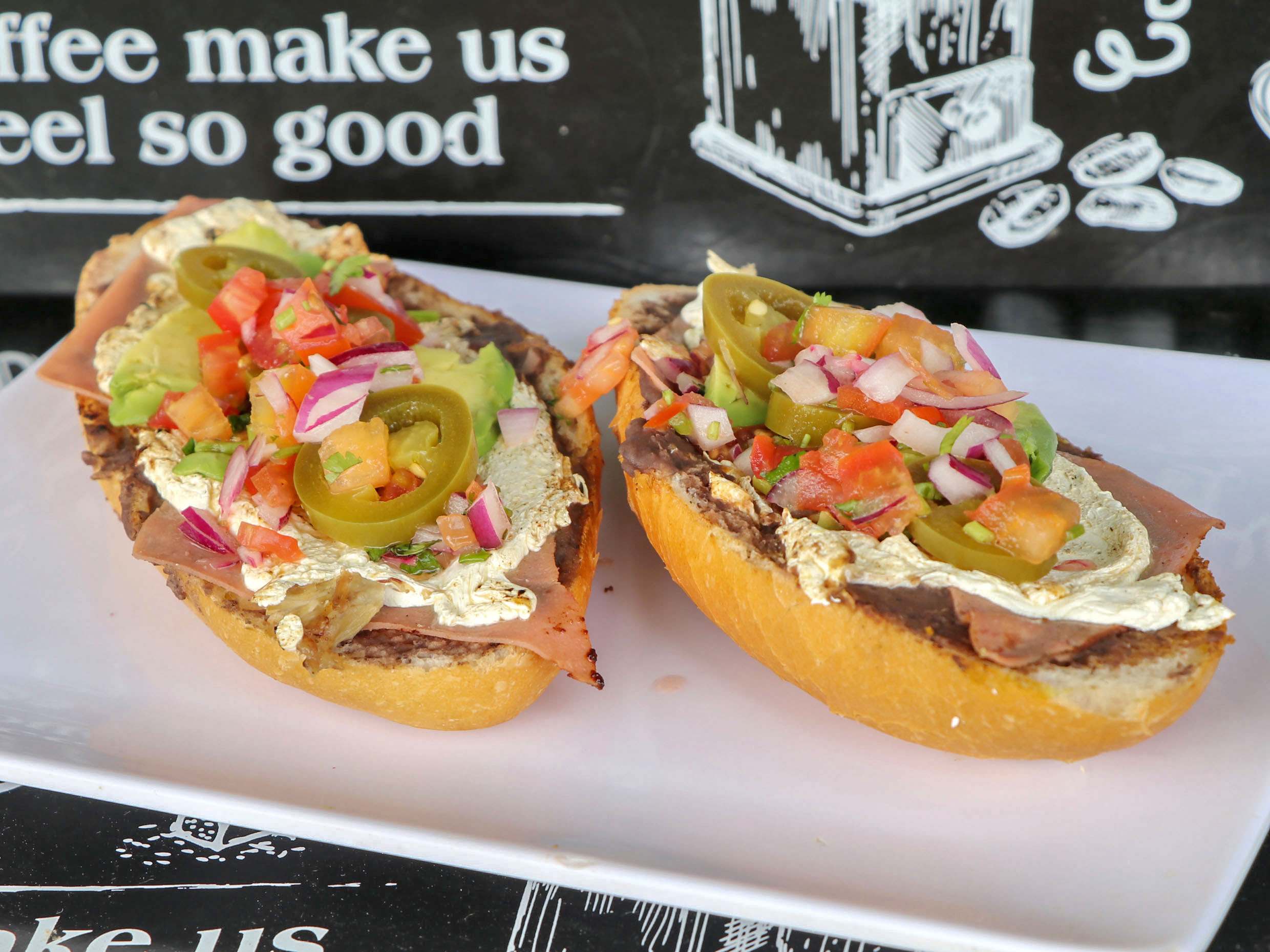 2 piezas de molletes, con jamon con frijol, queso,pico de gallo, aguacate y chiles.