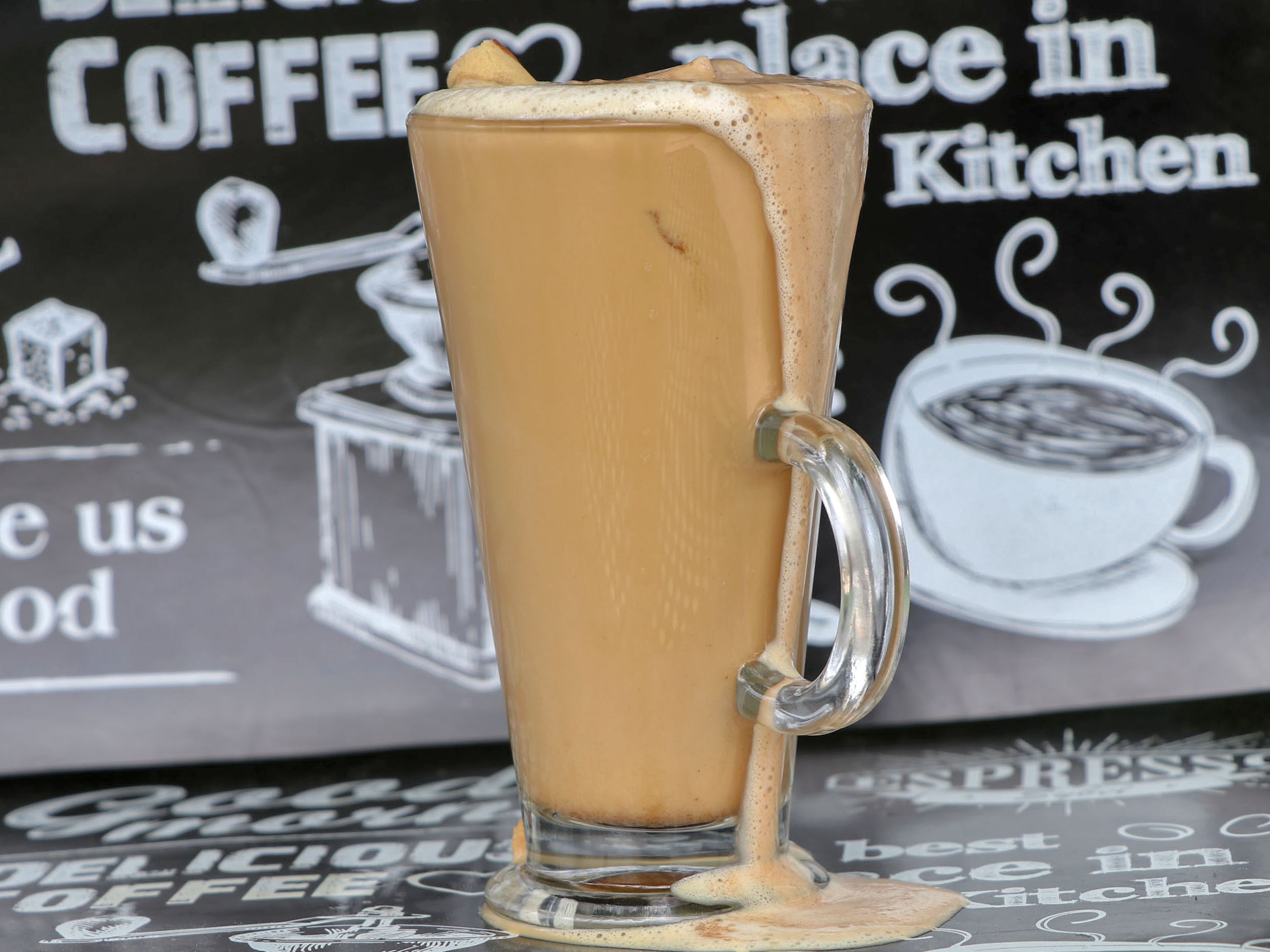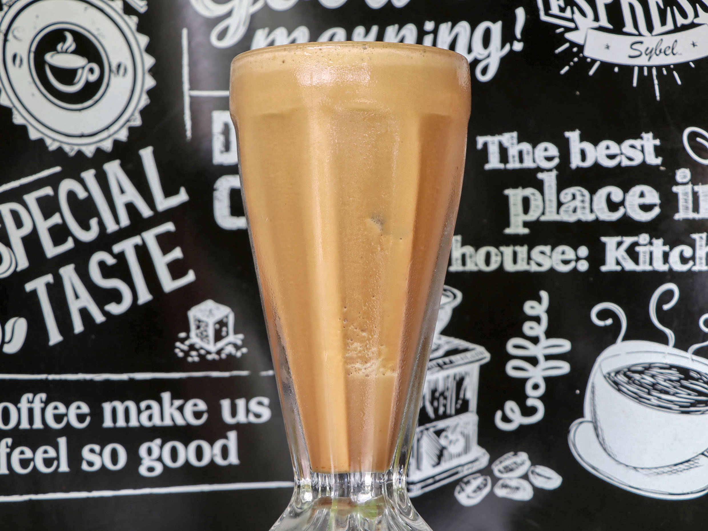 cafe latte con hielos preparado al momento.