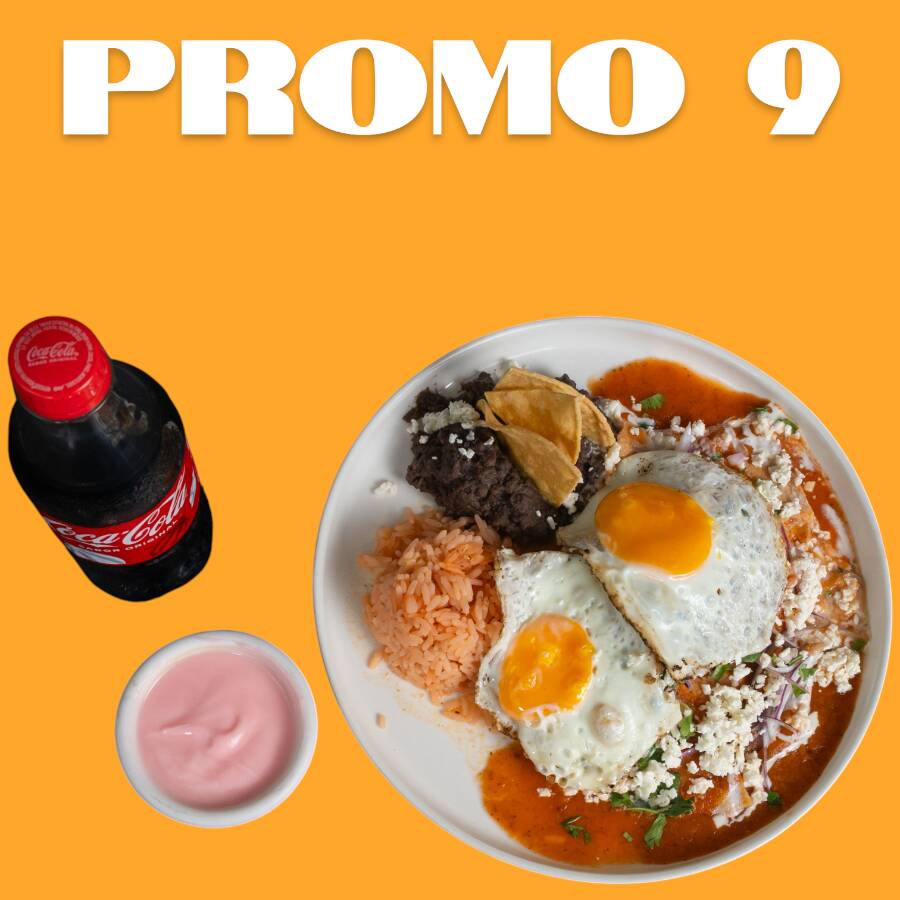 Chilaquiles con 2 huevos, arroz y frijoles con una bebida del dia + yogurth4oz o galleta