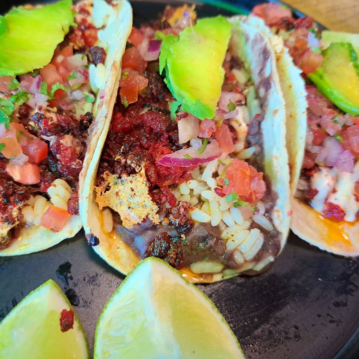 Órden de 3 tacos acompañados de arroz, frij, pico de gallo y salsa.