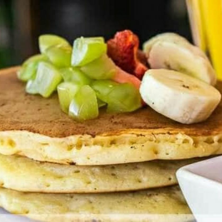 3 pzas hotcakes con fruta del dia+ bebida del dia + yogurth(4 oz) o galleta