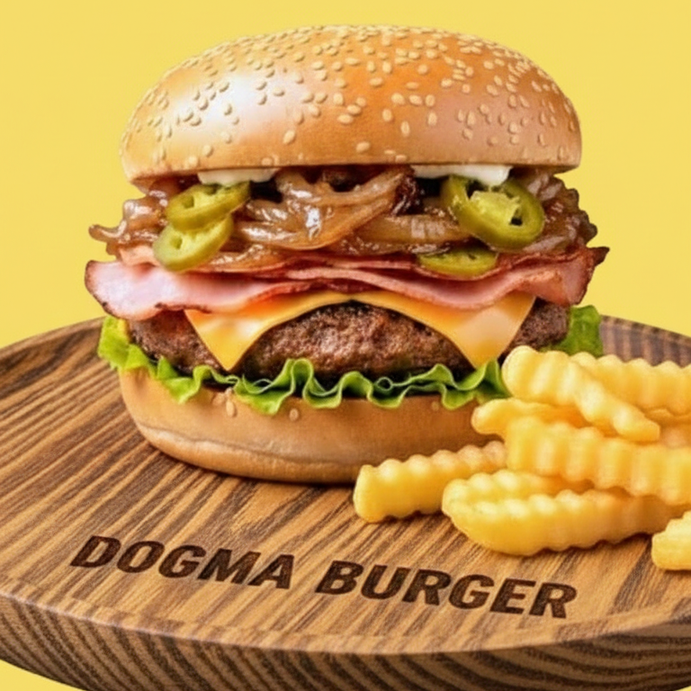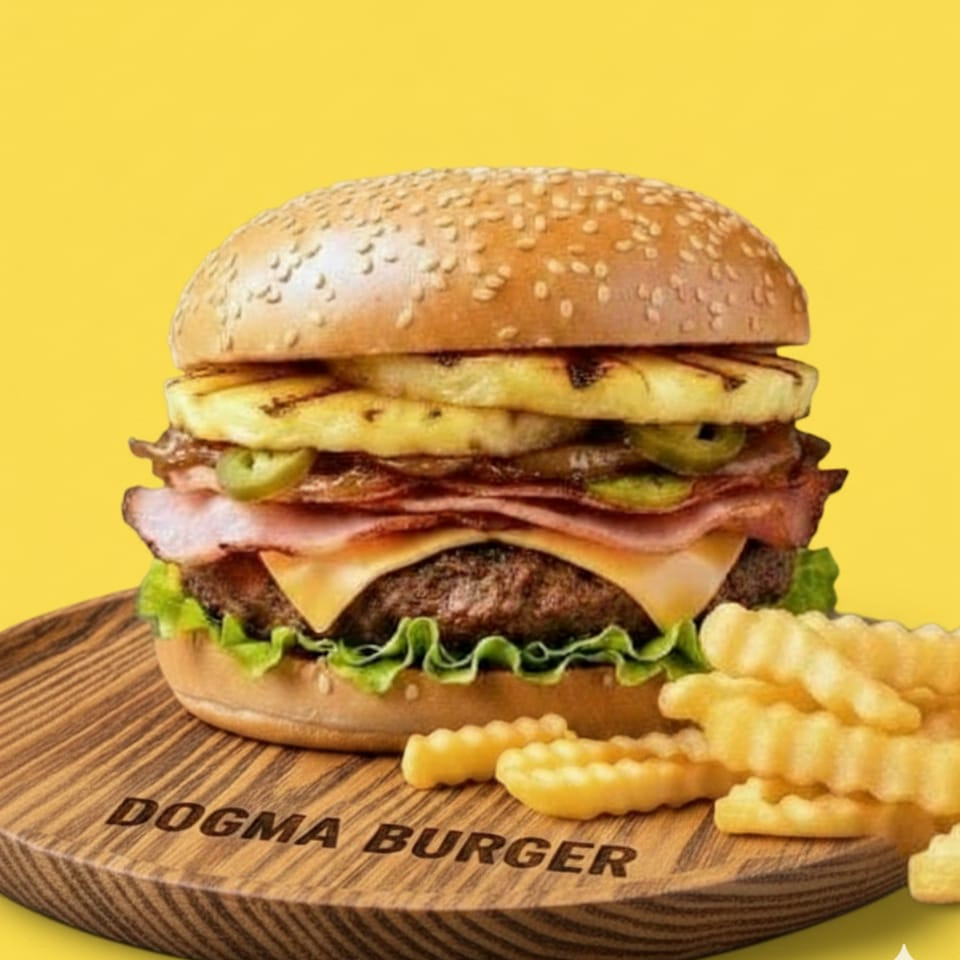 Rica carne de la casa, queso americano fundido, salchicha, jamón, acompañado de cebolla caramelizada con jalapeños, aderezo de la casa por fuera una tapa de pizza de hawaina. Incluye papas 🍔🍟