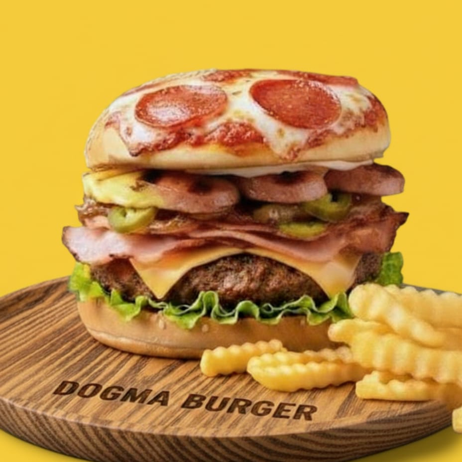 Rica carne de la casa, queso americano fundido, salchicha, jamón, acompañado de cebolla caramelizada con jalapeños, aderezo de la casa por fuera una tapa de pizza de peperroni. Incluye papas 🍔🍟