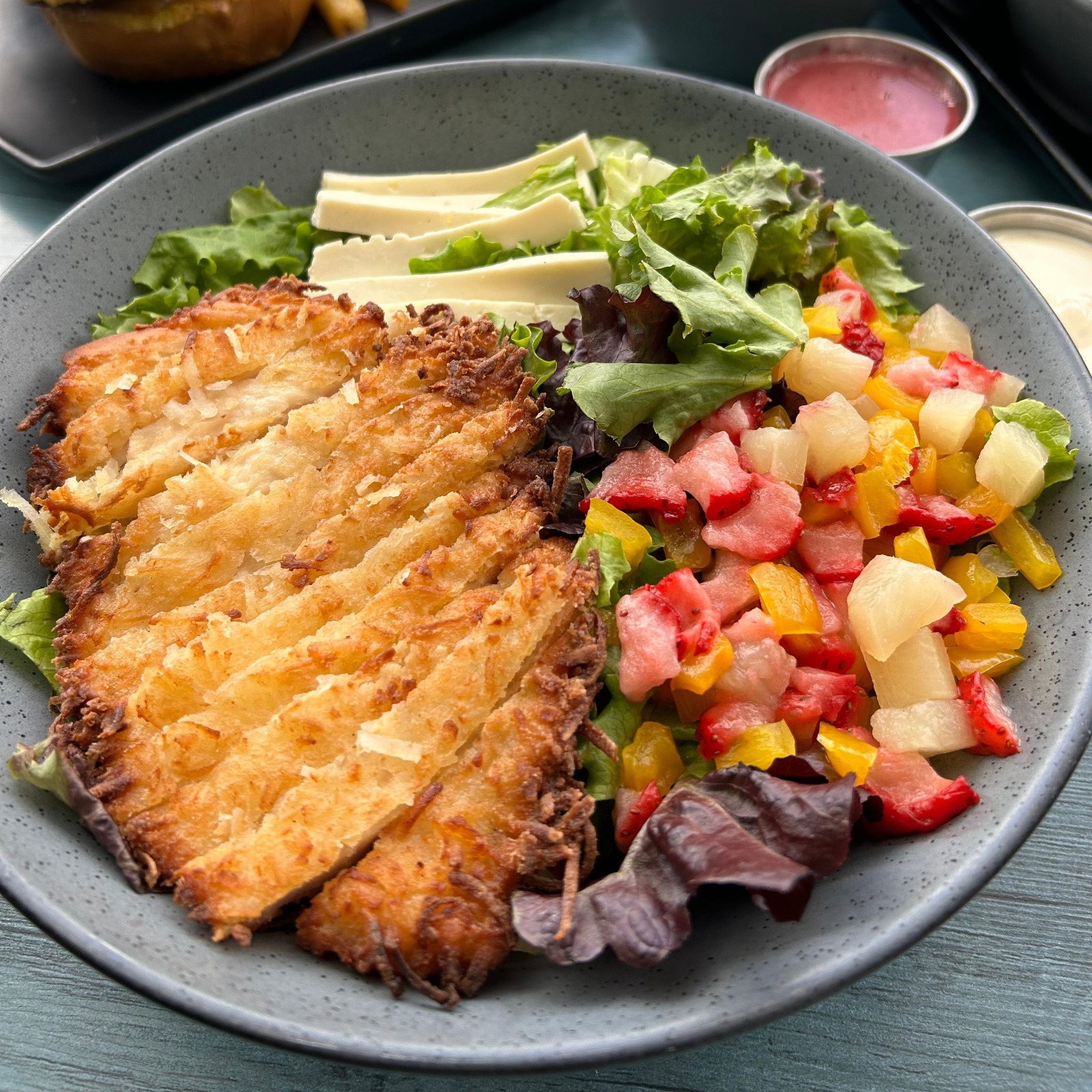 Ensalada con mix de lechuga fresca, queso panela (40g)*, mix caribeño de pimiento amarillo, fresa y piña, con pechuga al coco (150g)* y vinagreta de jamaica.