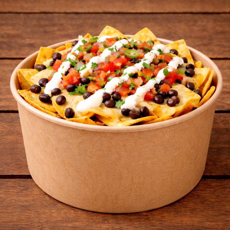 Generosa porción de totopos de maíz bañados en salsa de queso y cubiertos con frijolitos, crema y el tradicional Pico de Gallo