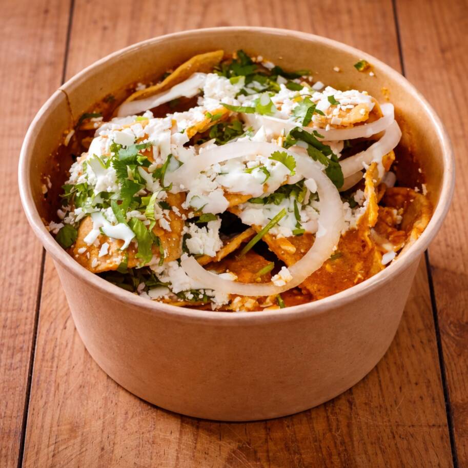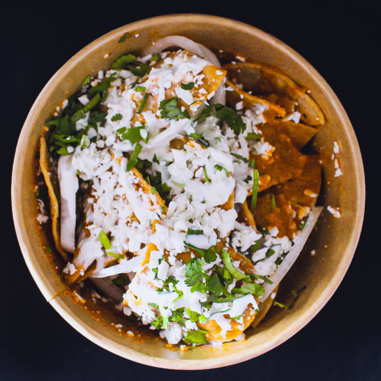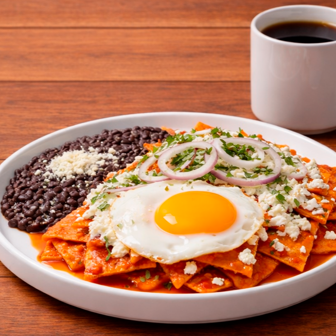 Generosa porción de totopos de maíz bañados con la salsa clásica de tu elección, montados en una cama de frijolitos refritos y cubiertos con crema, queso fresco, cebolla y cilantro