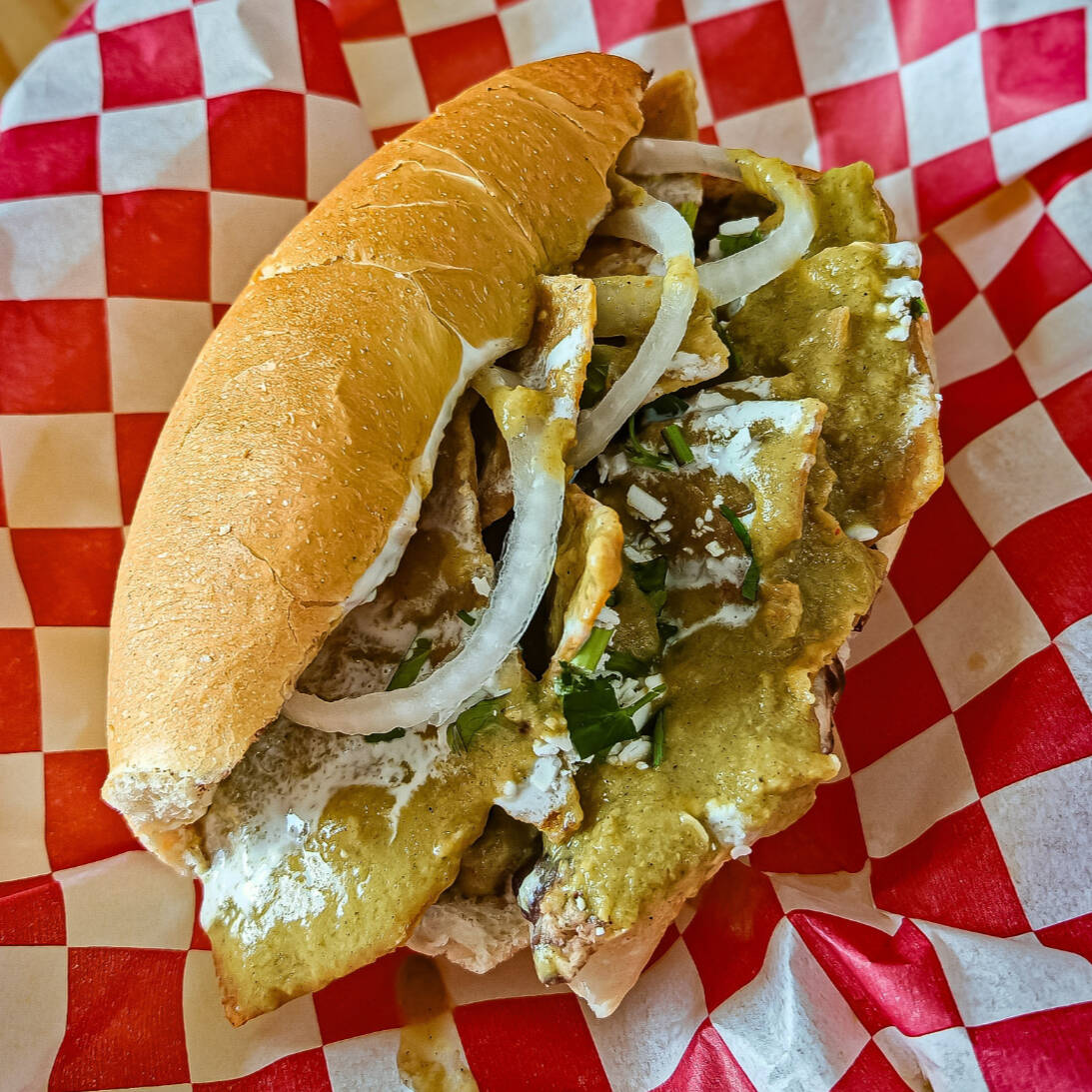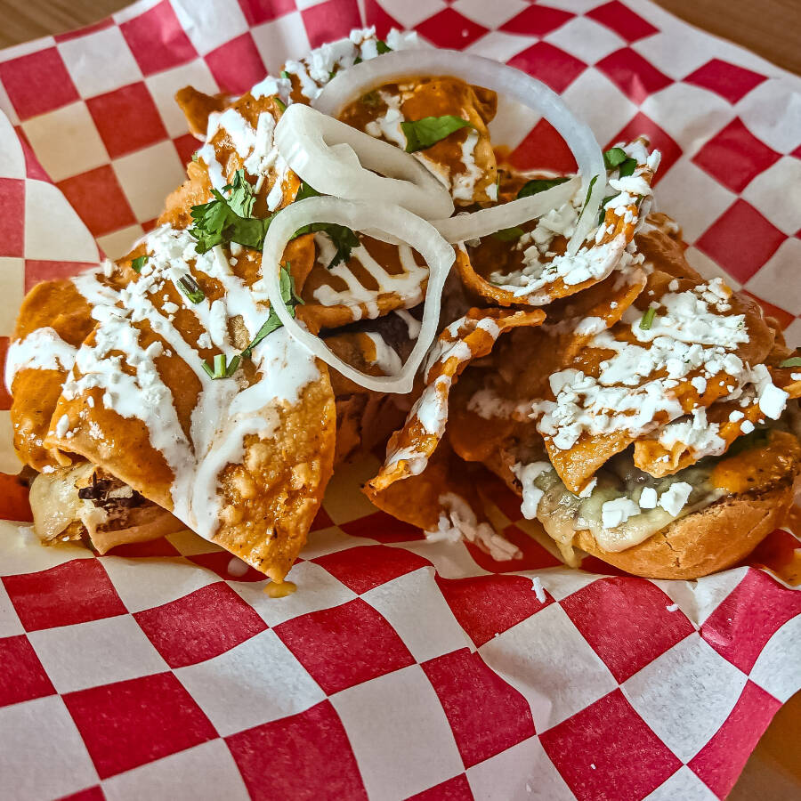 2 mitades de bolillo rellenas de frijolitos refritos, gratinadas con nuestra mezcla de 4 quesos, cebolla y cilantro y cubiertos con chilaquiles con la salsa cremosa de tu preferencia, crema y queso fresco
