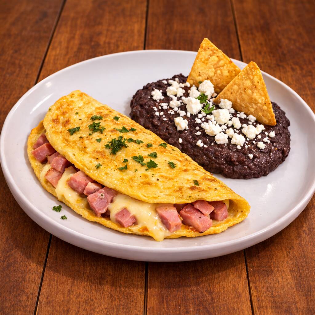 La combinación perfecta: esponjoso omelette relleno de jamón de pierna y pavo seleccionado y nuestra mezcla de 4 quesos, acompañado de frijoles refritos y la salsa de tu elección.