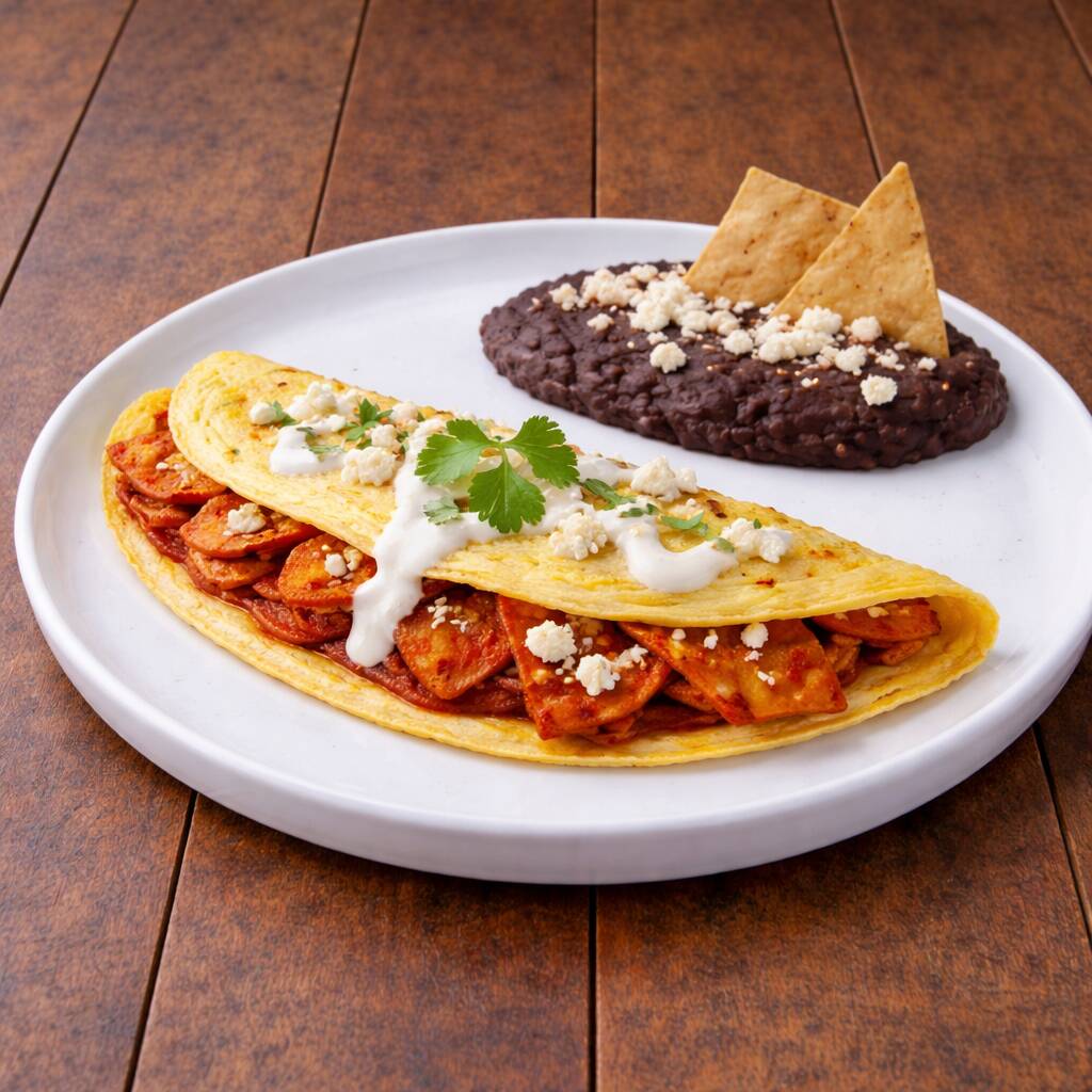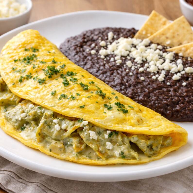 Esponjoso omelette de 3 huevos preparado al momento, relleno de Chilaquiles con la Salsa Clásica de tu elección. Servido caliente, con una textura suave por dentro y ligeramente dorado por fuera, ideal para un desayuno o brunch lleno de sabor.