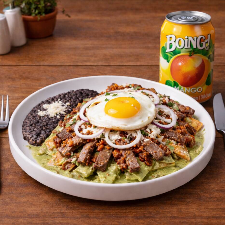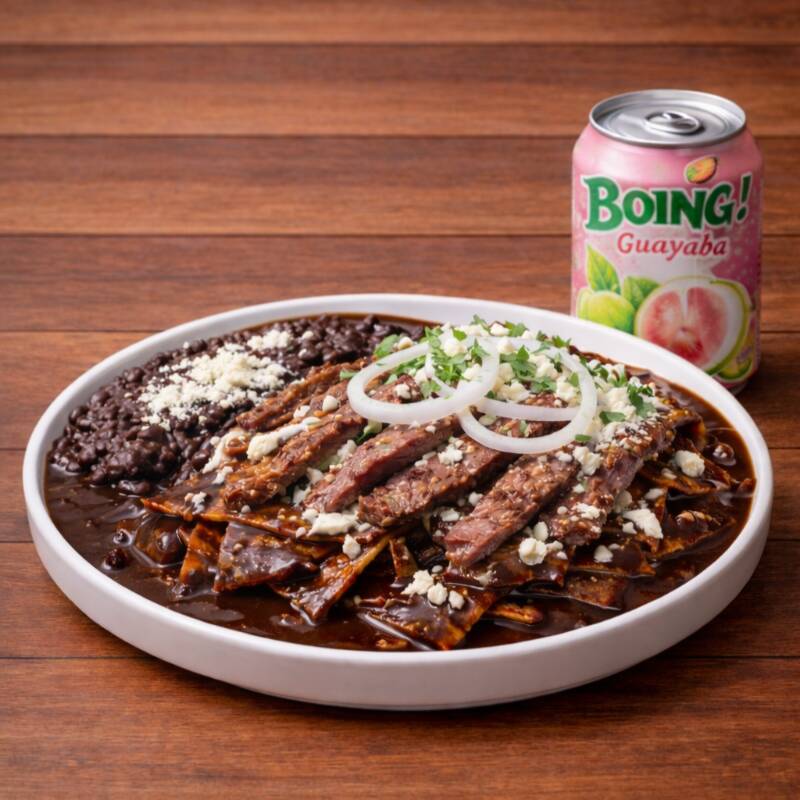Chilaquiles Clásicos Mole*1 + Bistec*1 + Boing de Lata 355 ml.*1
