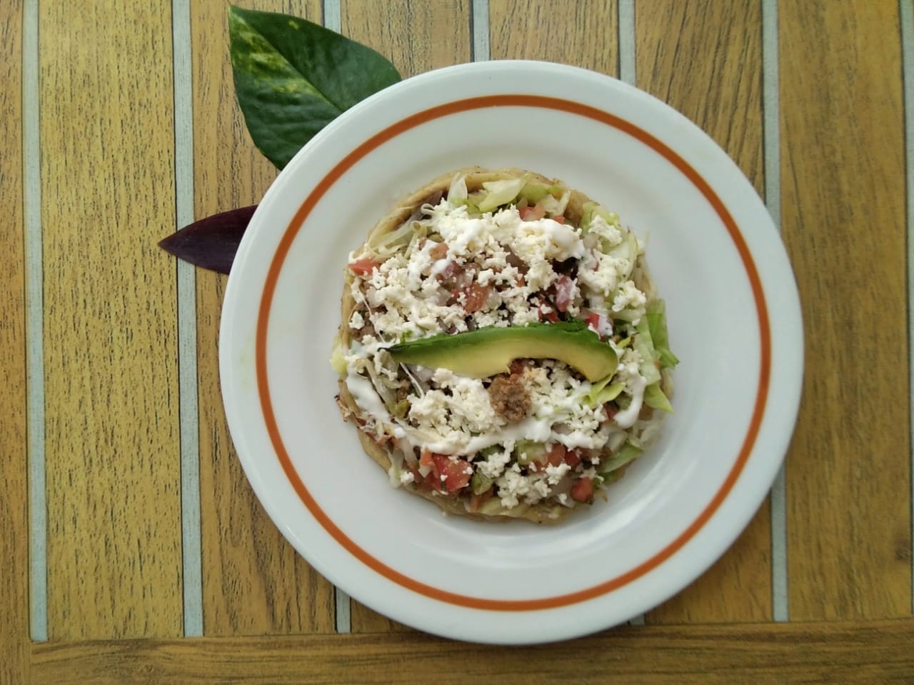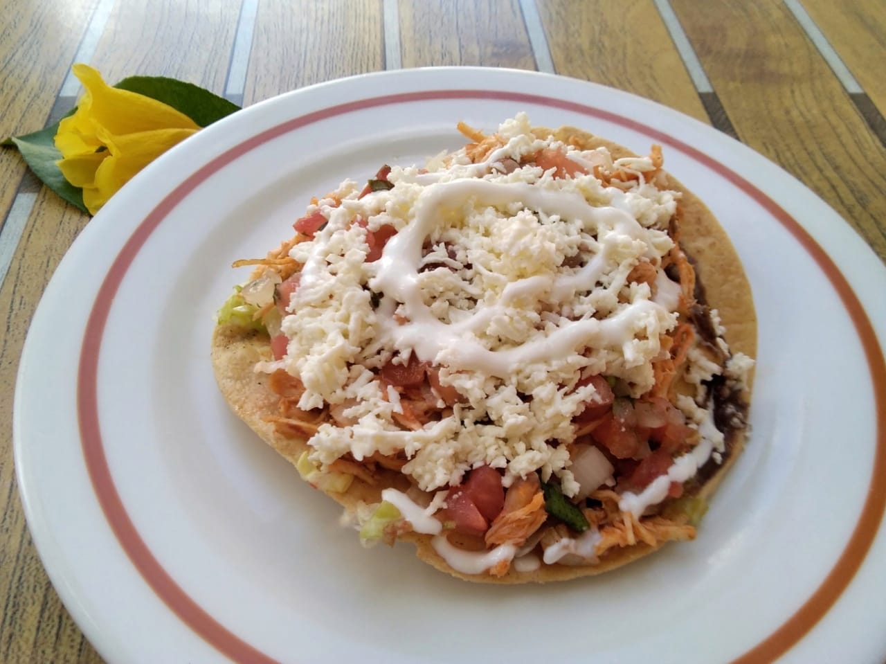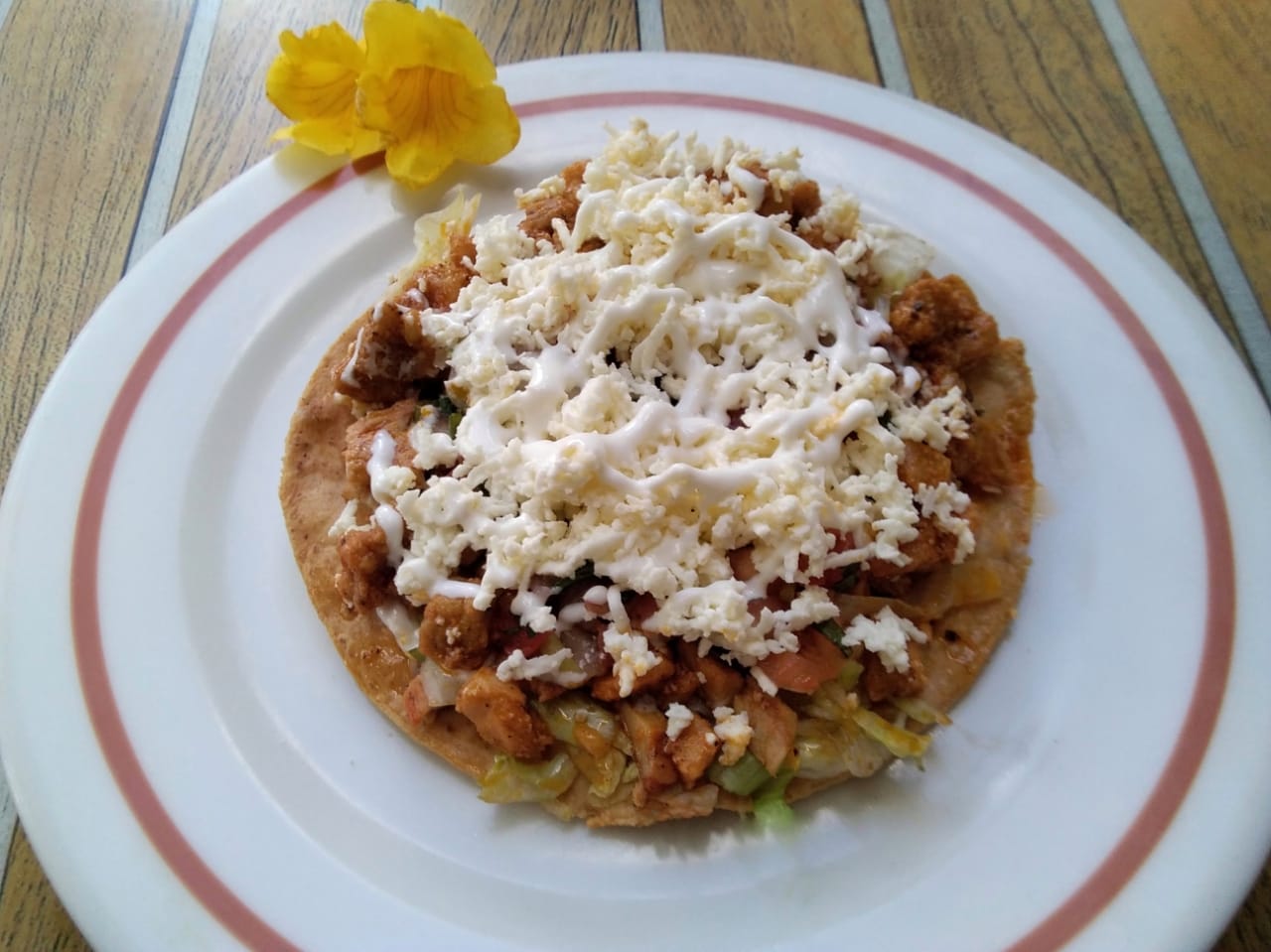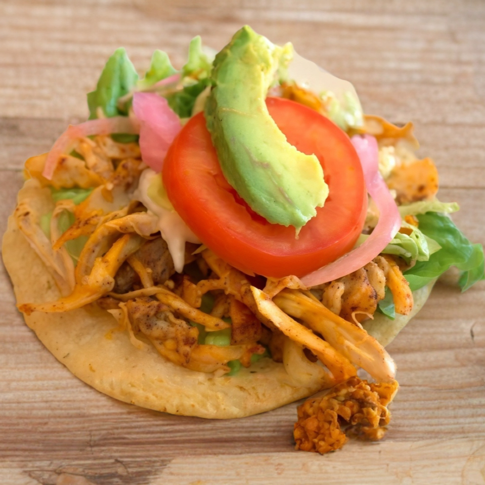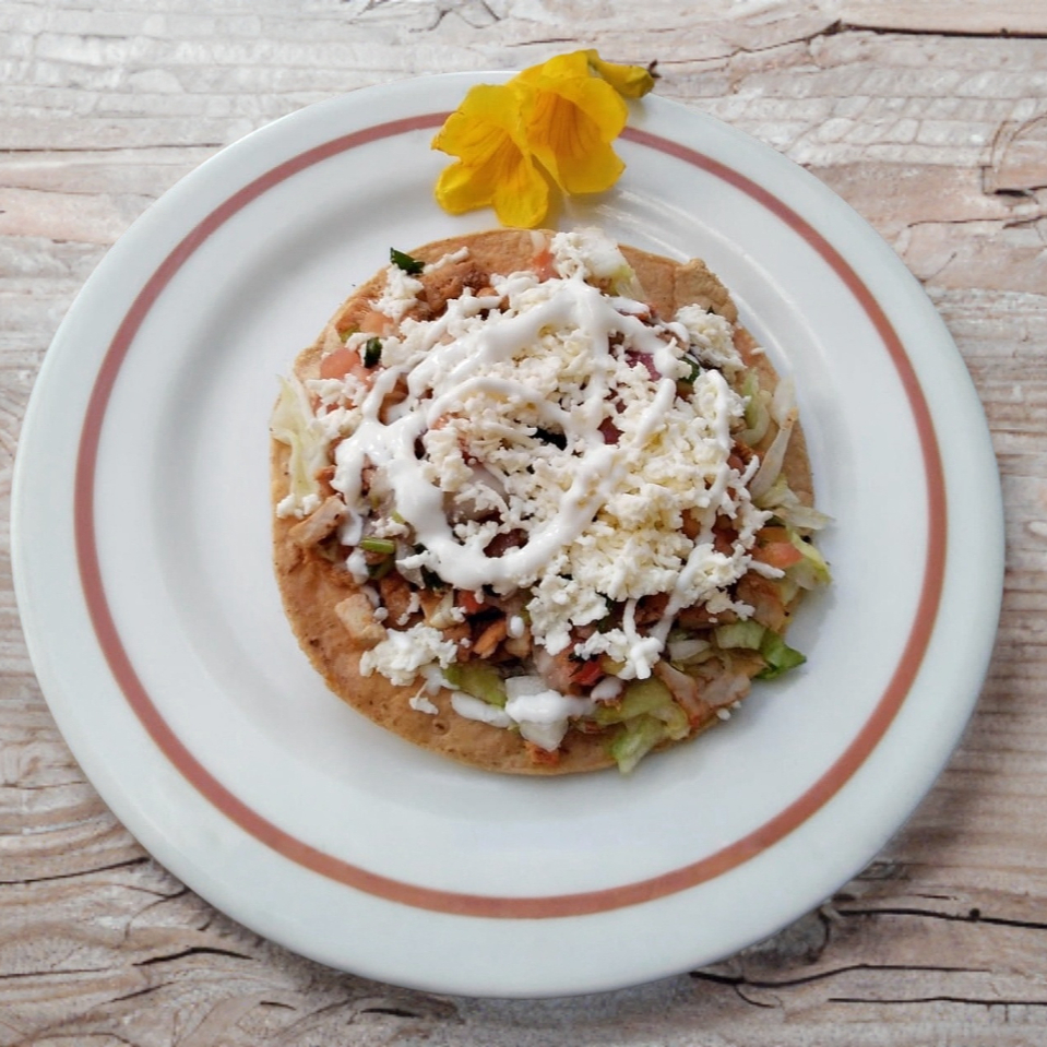 Tortilla de maíz frita hecha a mano con tu guisado favorito lleva lechuga queso fresco y crema