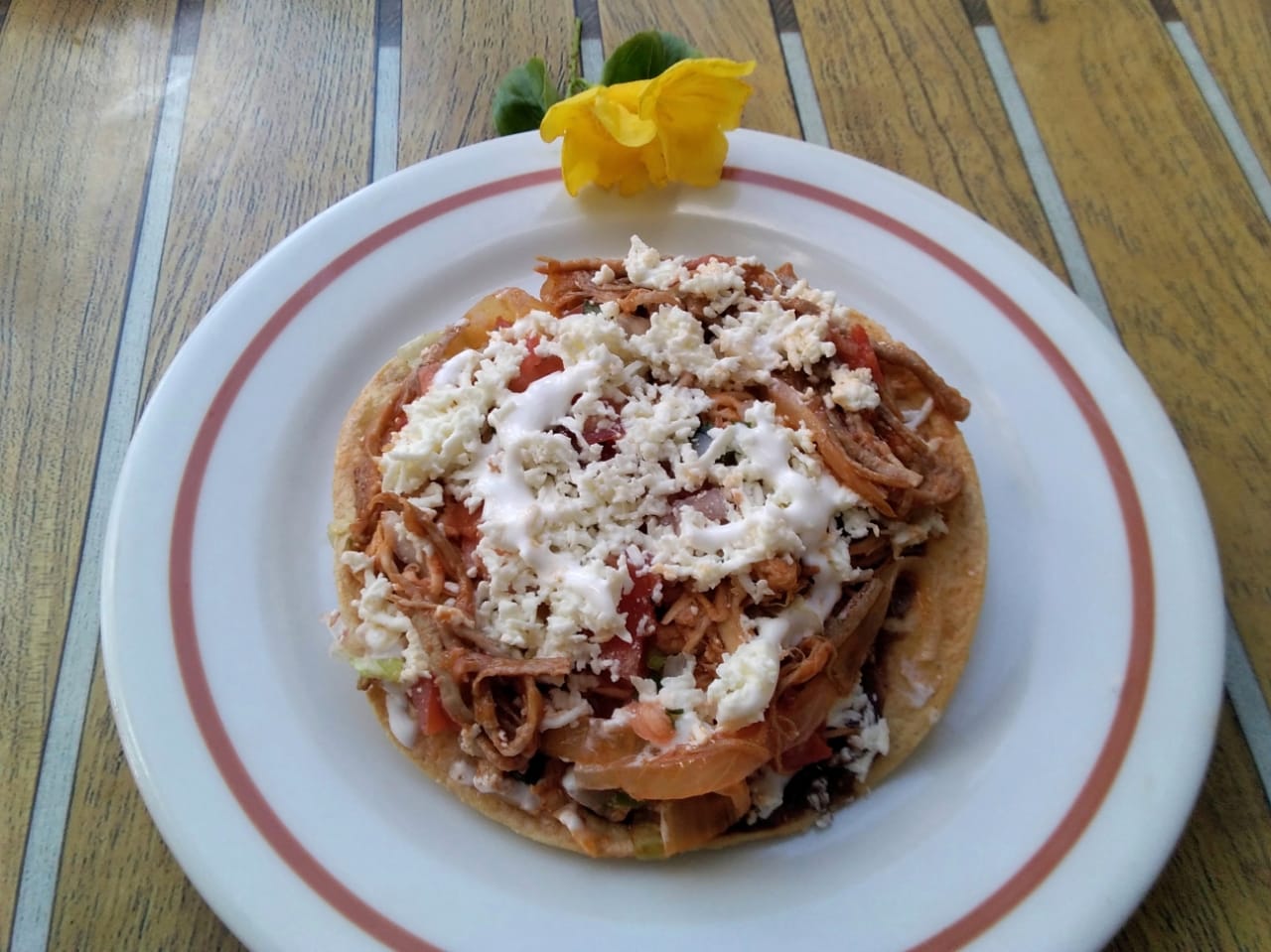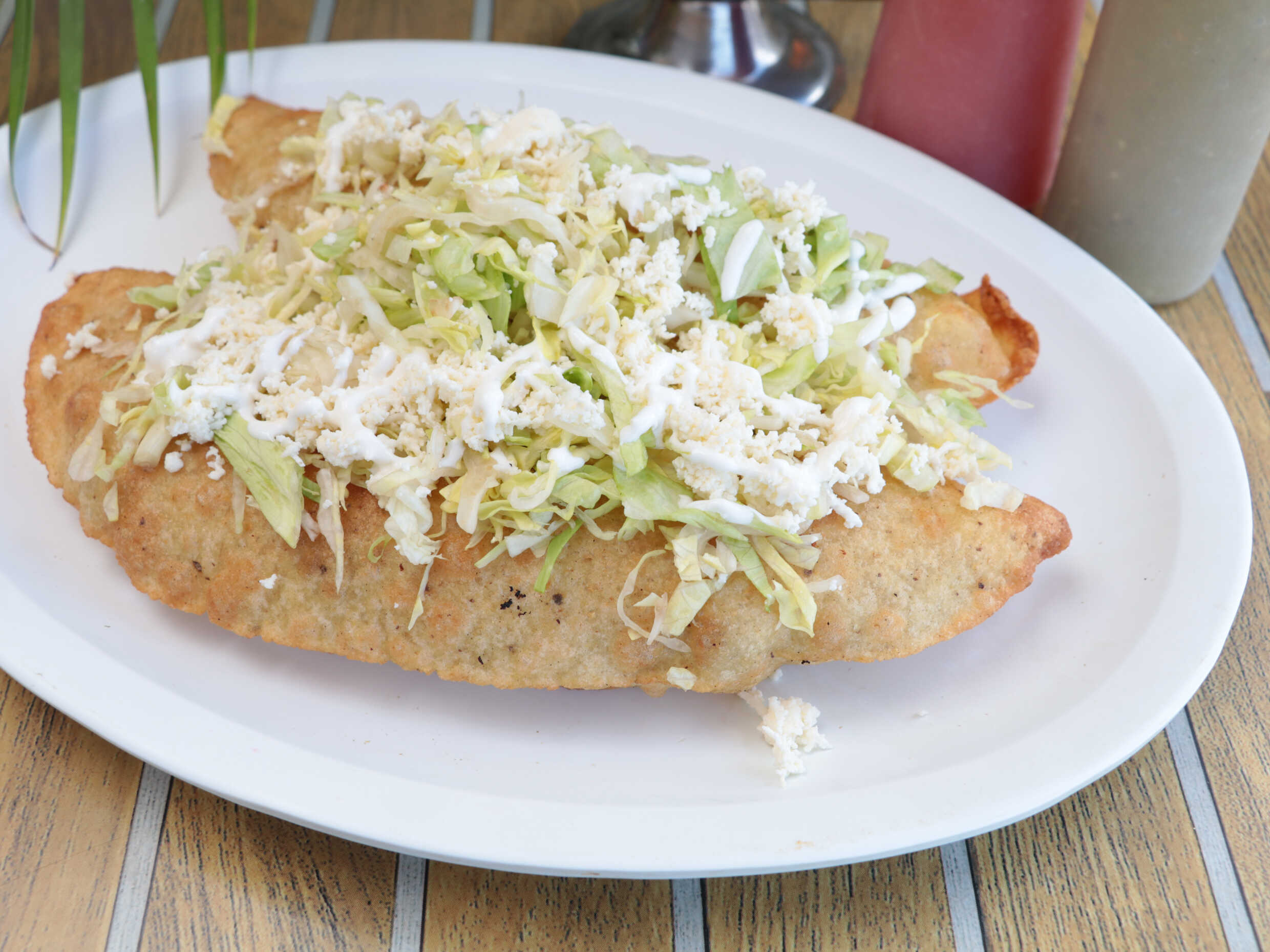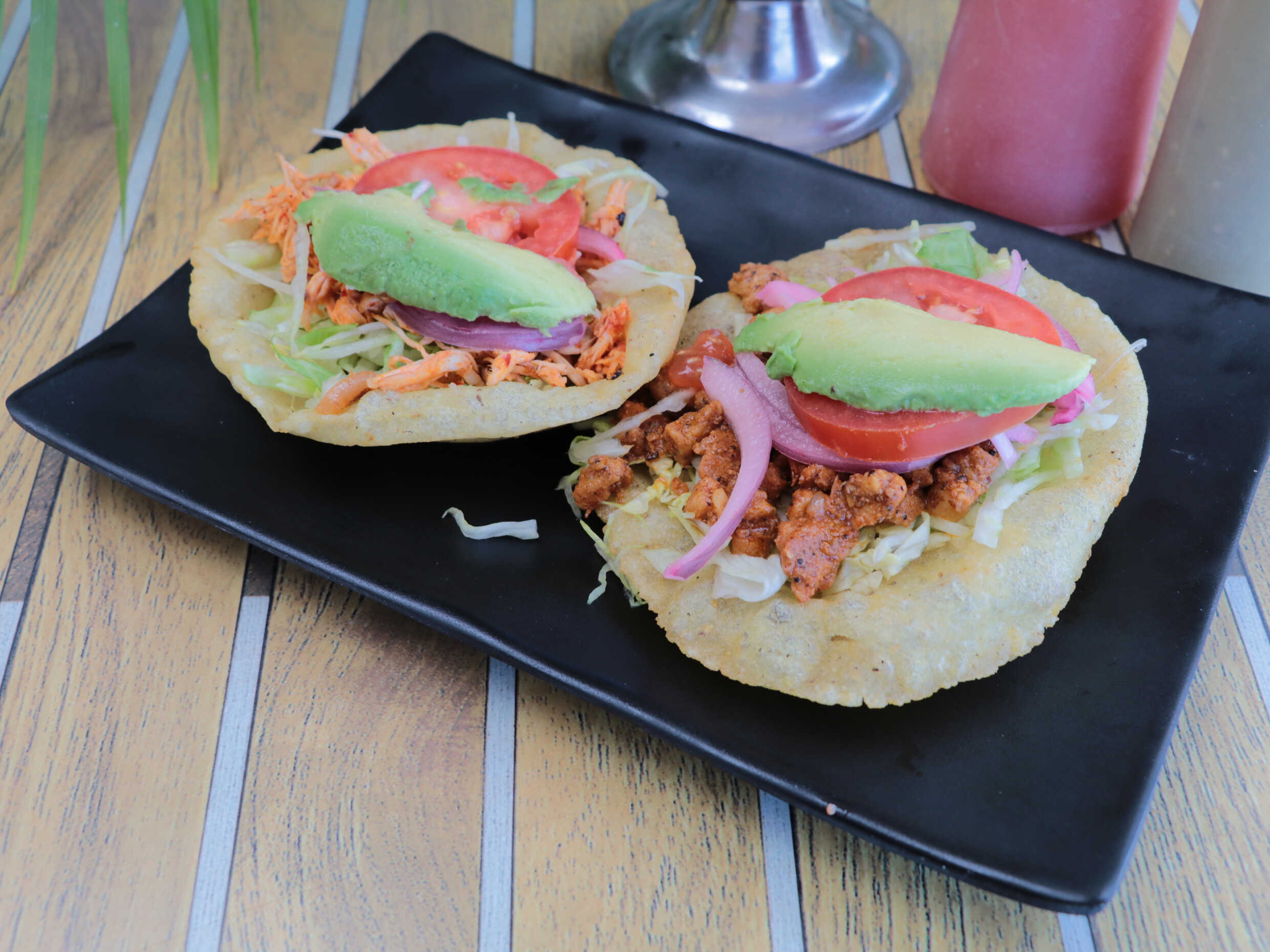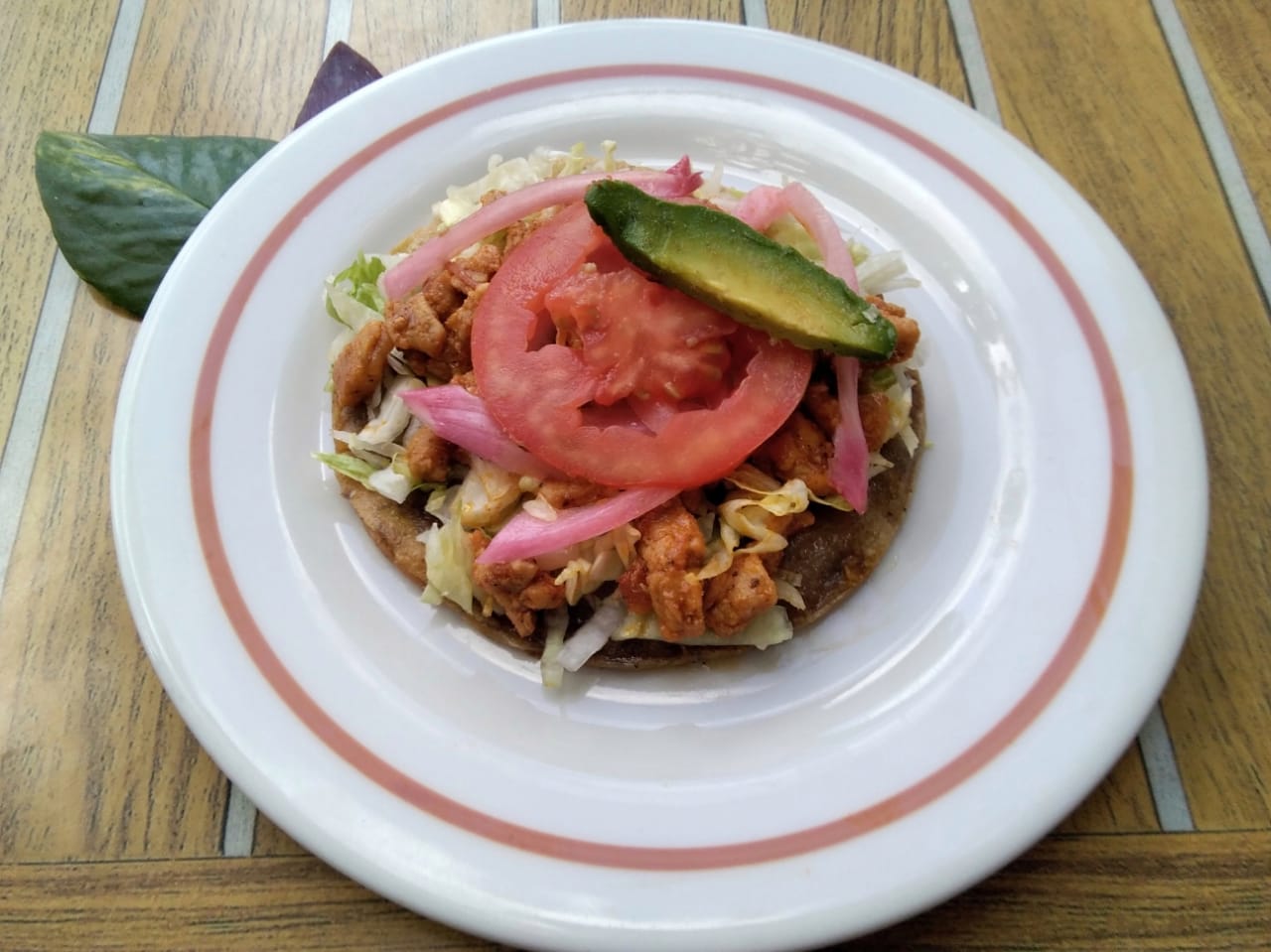 Tortilla de maíz frita hecha a mano con tu guisado favorito lleva lechuga queso fresco y crema