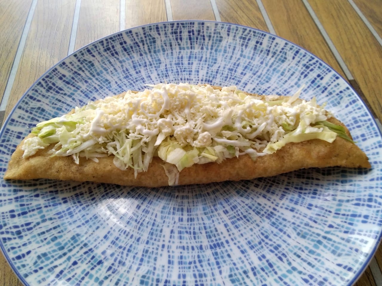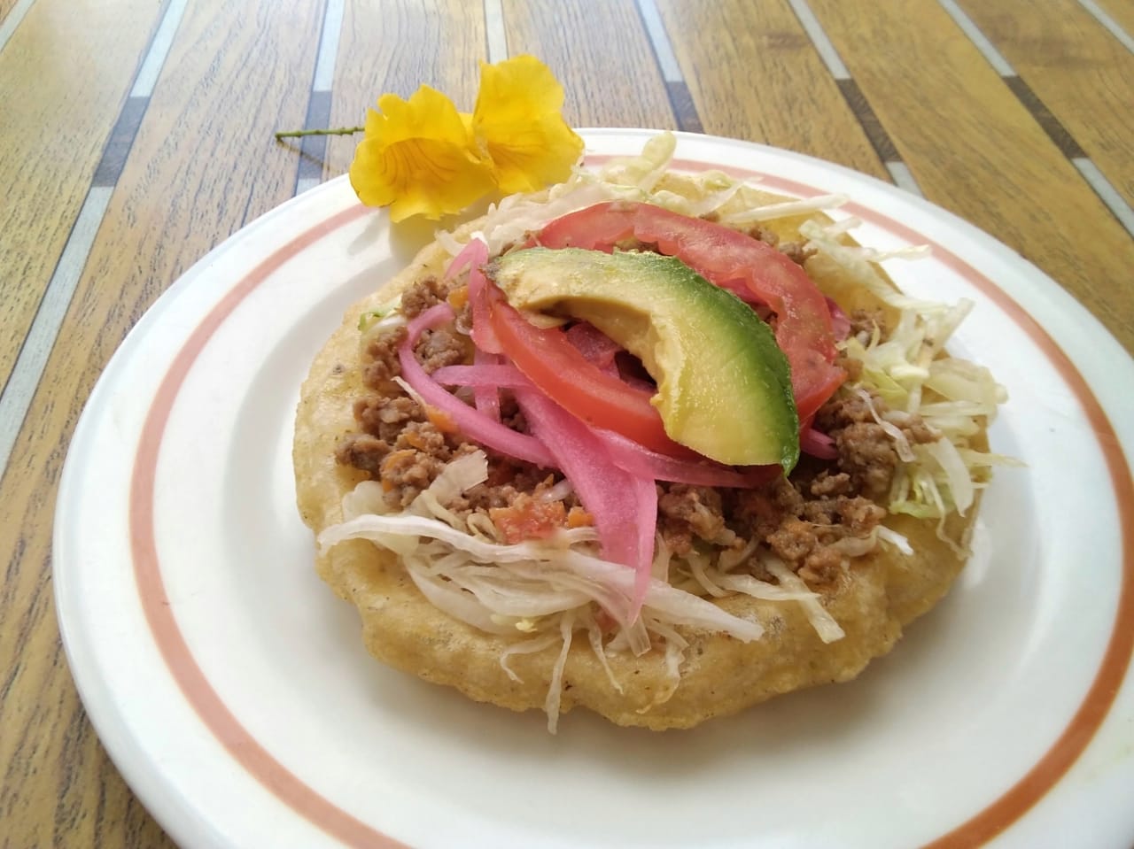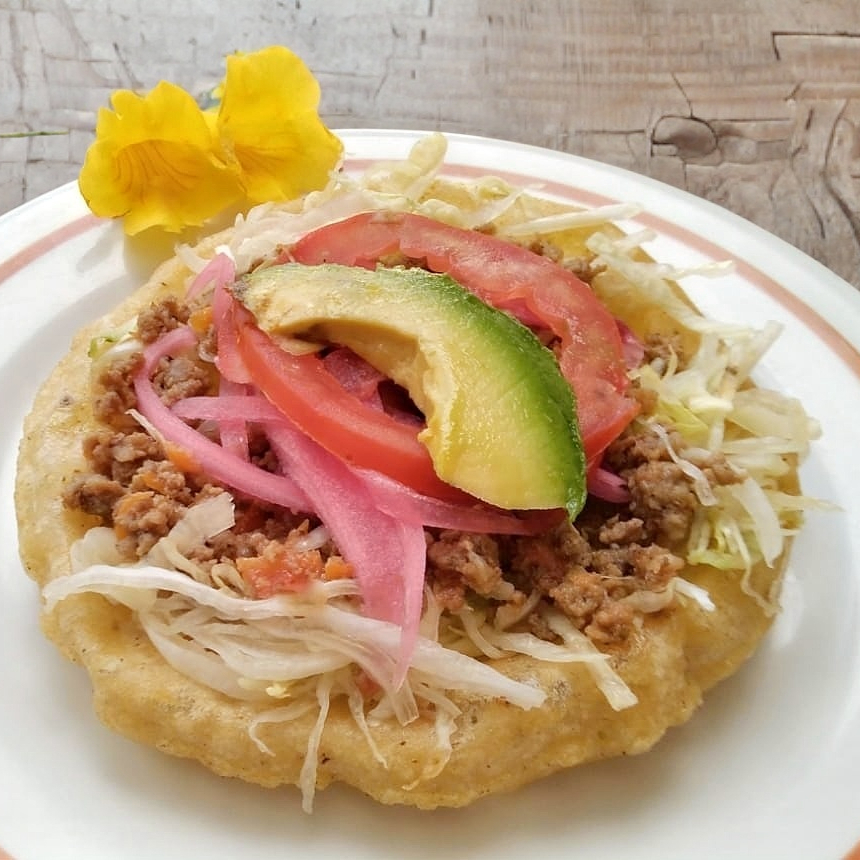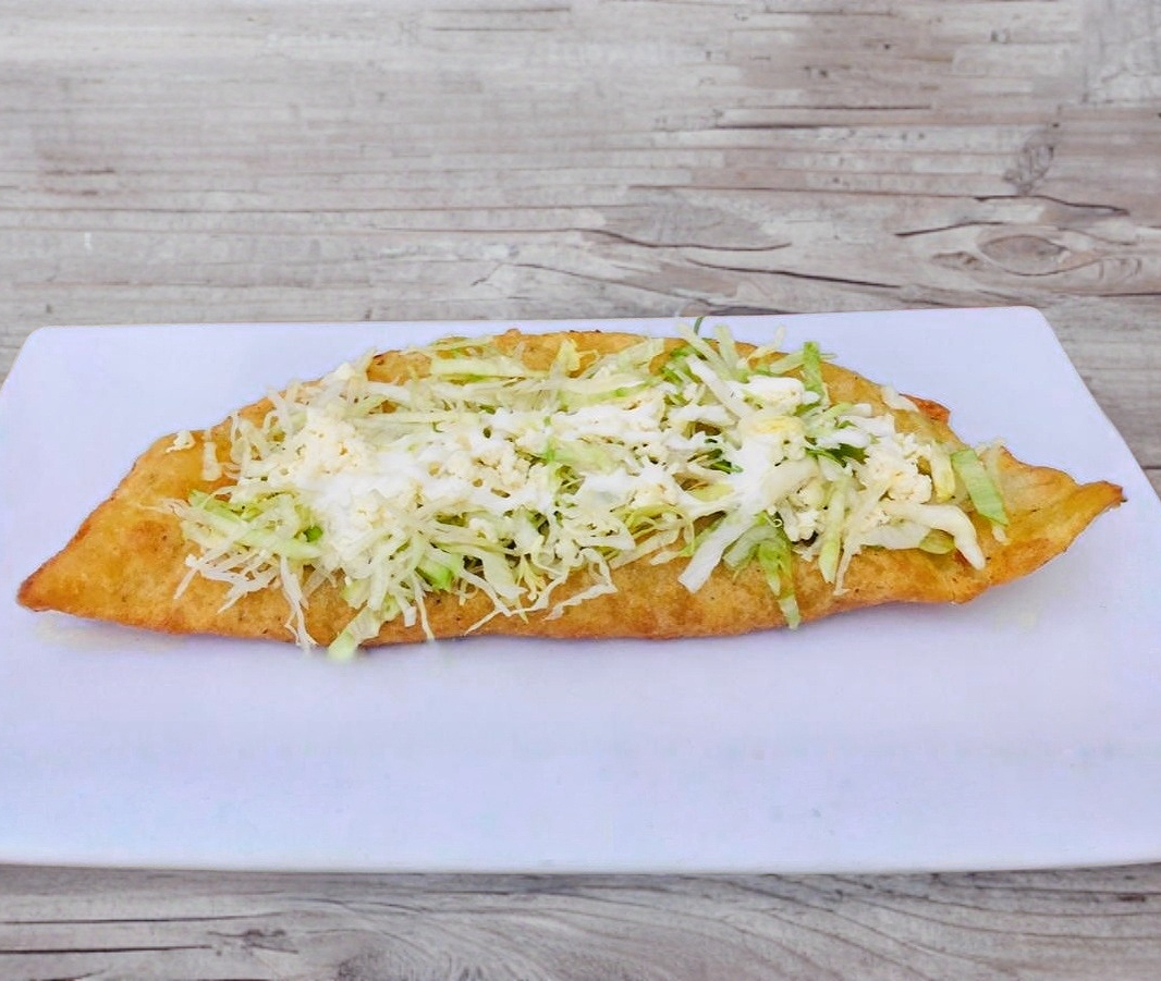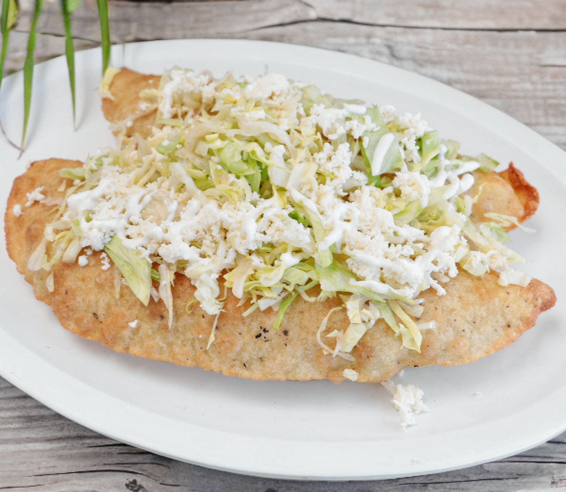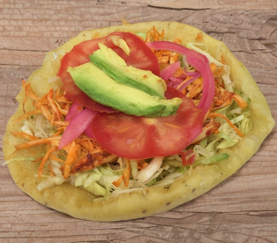 TORTILLA DE MAIZ FRITA HECHA A MANO CON TU GUISADO FAVORITO, QUESO , LECHUGA Y AGUACATE