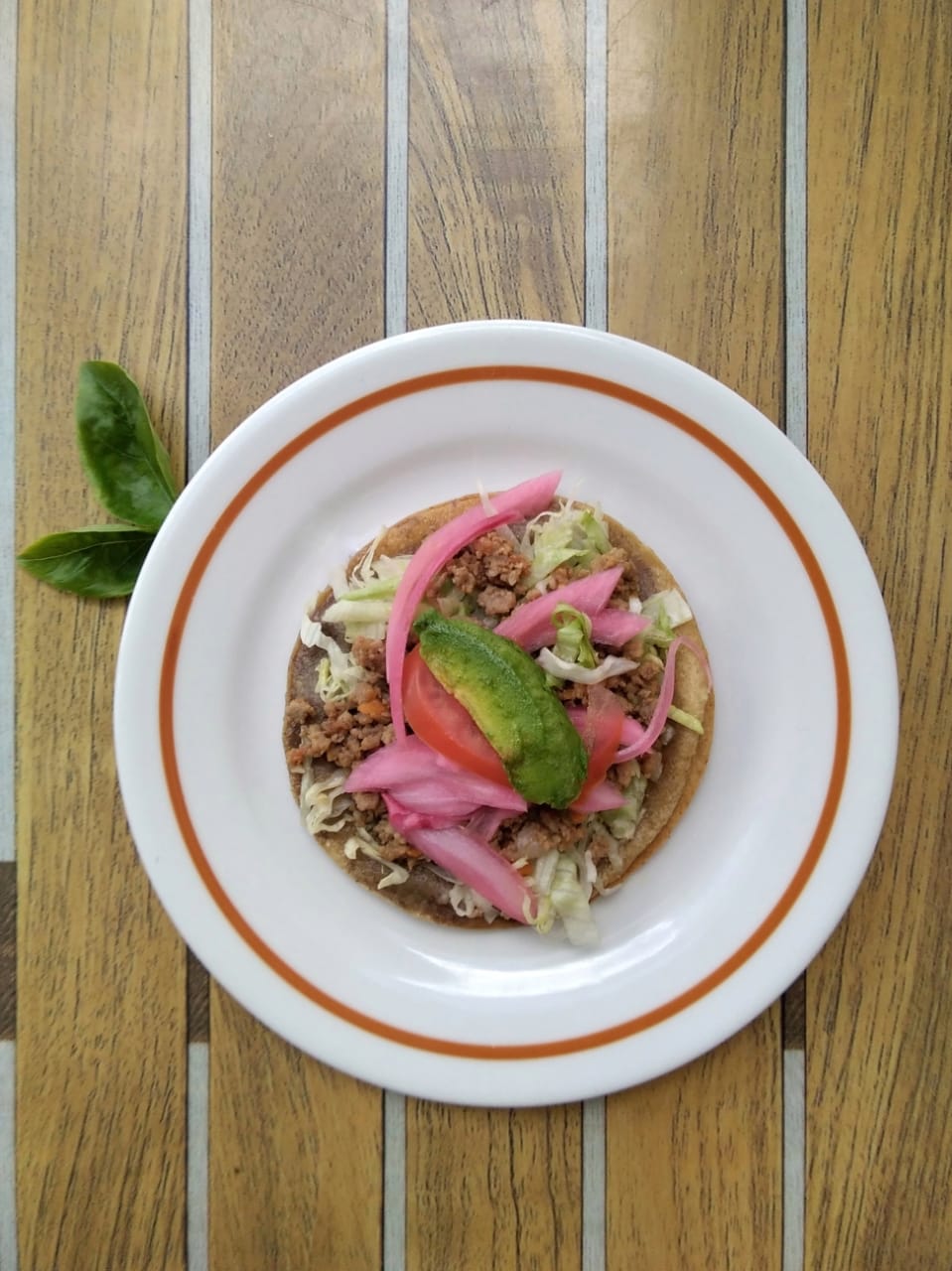 Tortilla hecha a mano al comal, con ricos frijoles de la casa, lechuga, tu guisado favorito, salsa mexicana, queso fresco, media crema y aguacate