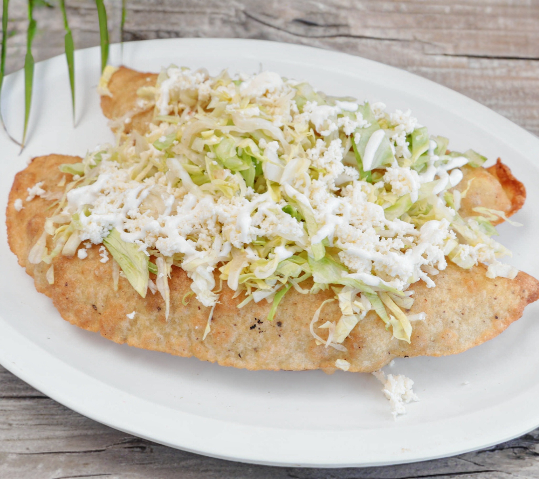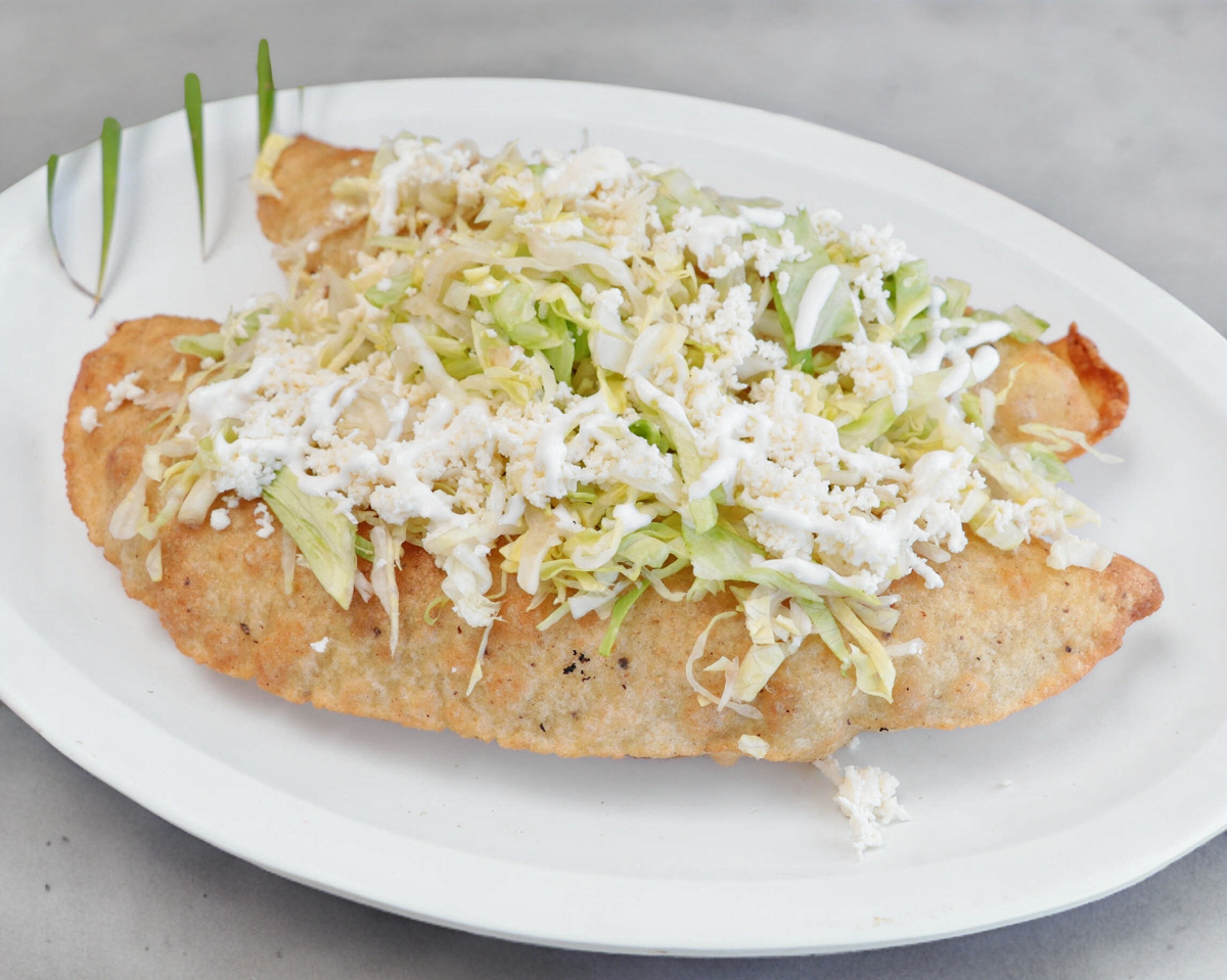 TORTILLA DE MAIZ FRITA HECHA A MANO CON TU GUISADO FAVORITO, QUESO , LECHUGA Y CREMA.