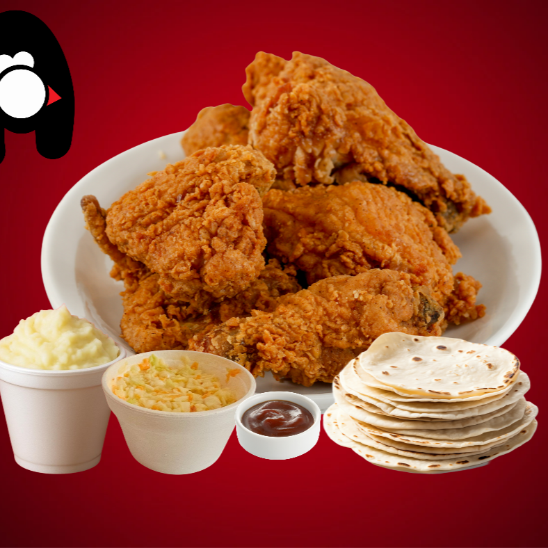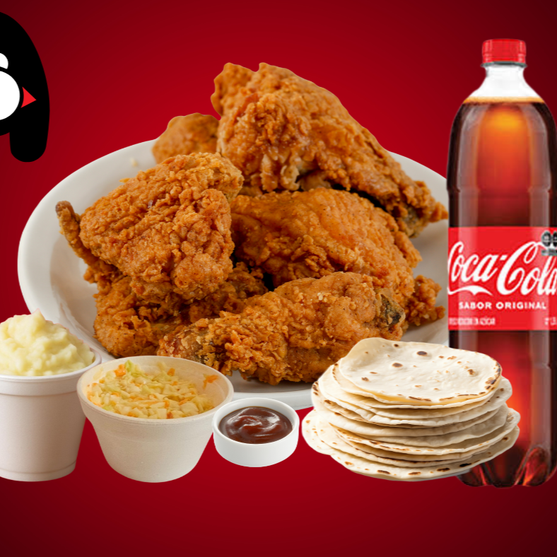 1 kg de pollo , 1 refresco 1.35 ml , pure de papa, ensalada, salsas jalapeño y tamarindo, tortillas