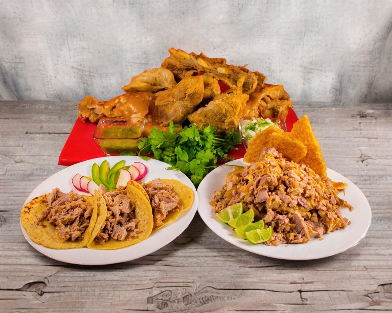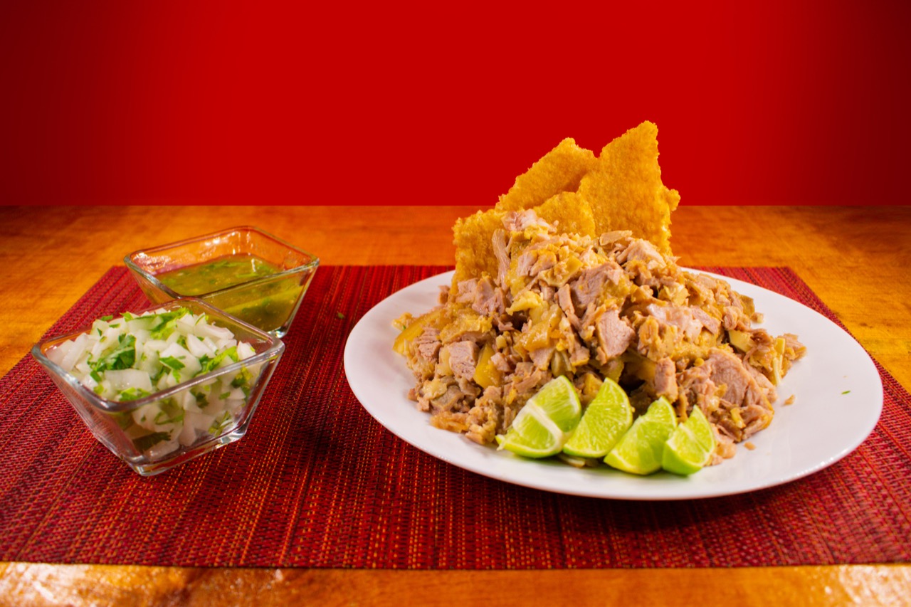 Incluye chicharrón, tortillas, cebolla y cilantro