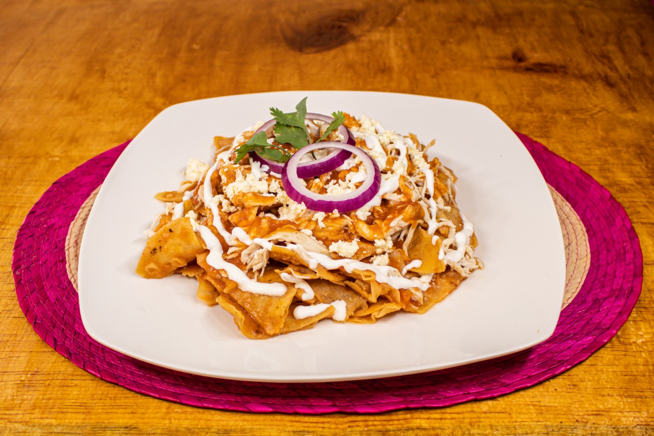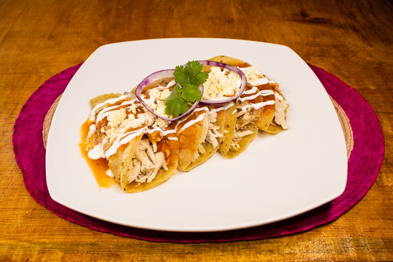 TOTOPOS BAÑADOS EN SALSA ROJA ACOMPAÑADOS DE POLLO, CREMA, QUESO, CEBOLLA Y CILANTRO