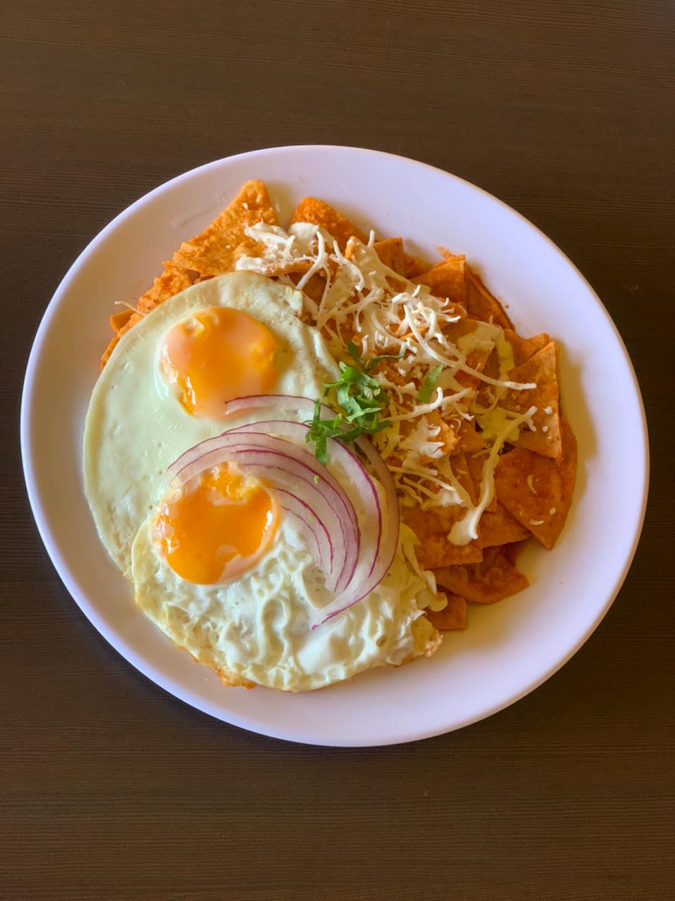 TOTOPOS BAÑADOS EN SALSA ROJA ACOMPAÑADOS DE HUEVO, CREMA, QUESO, CILANTRO Y CEBOLLA