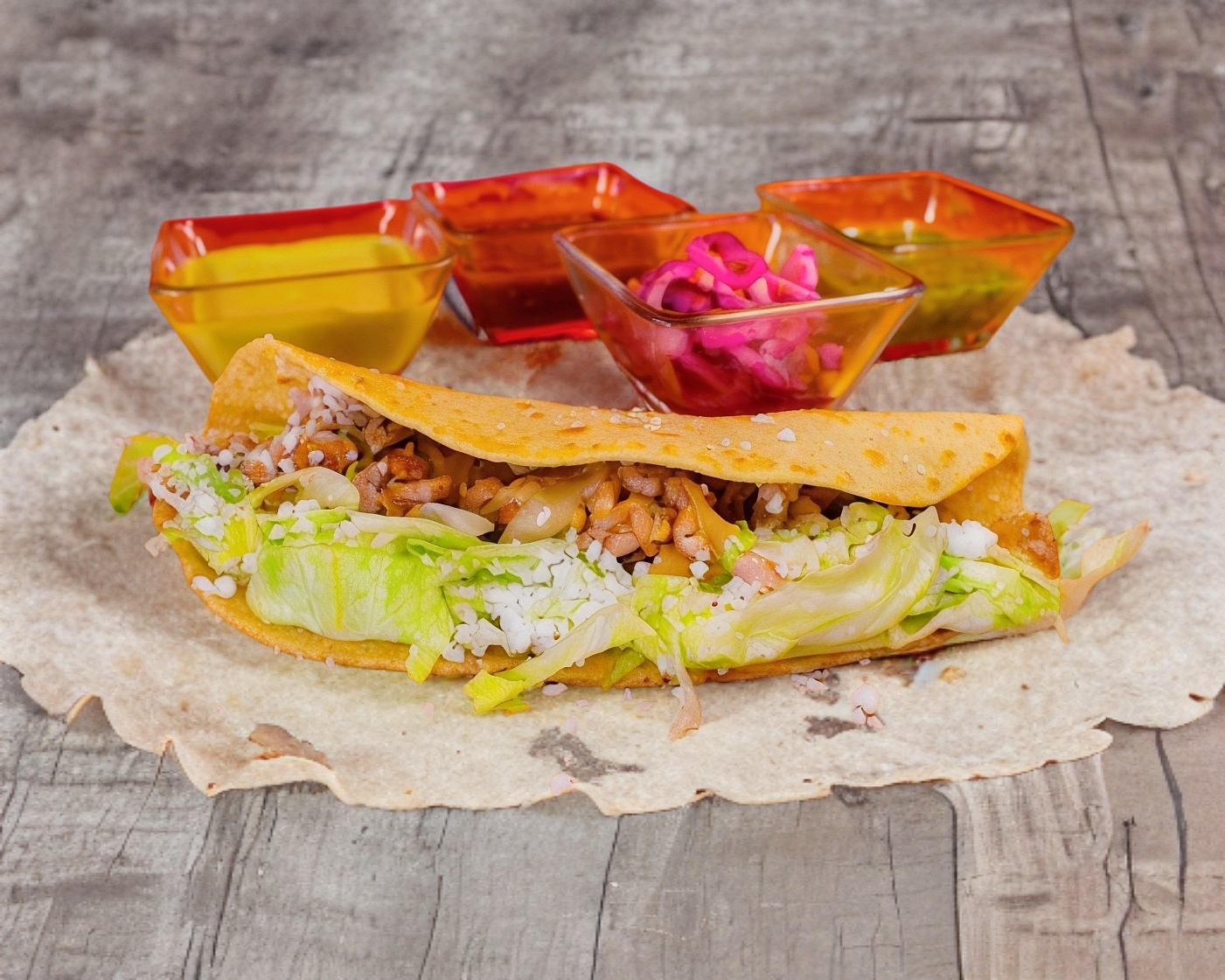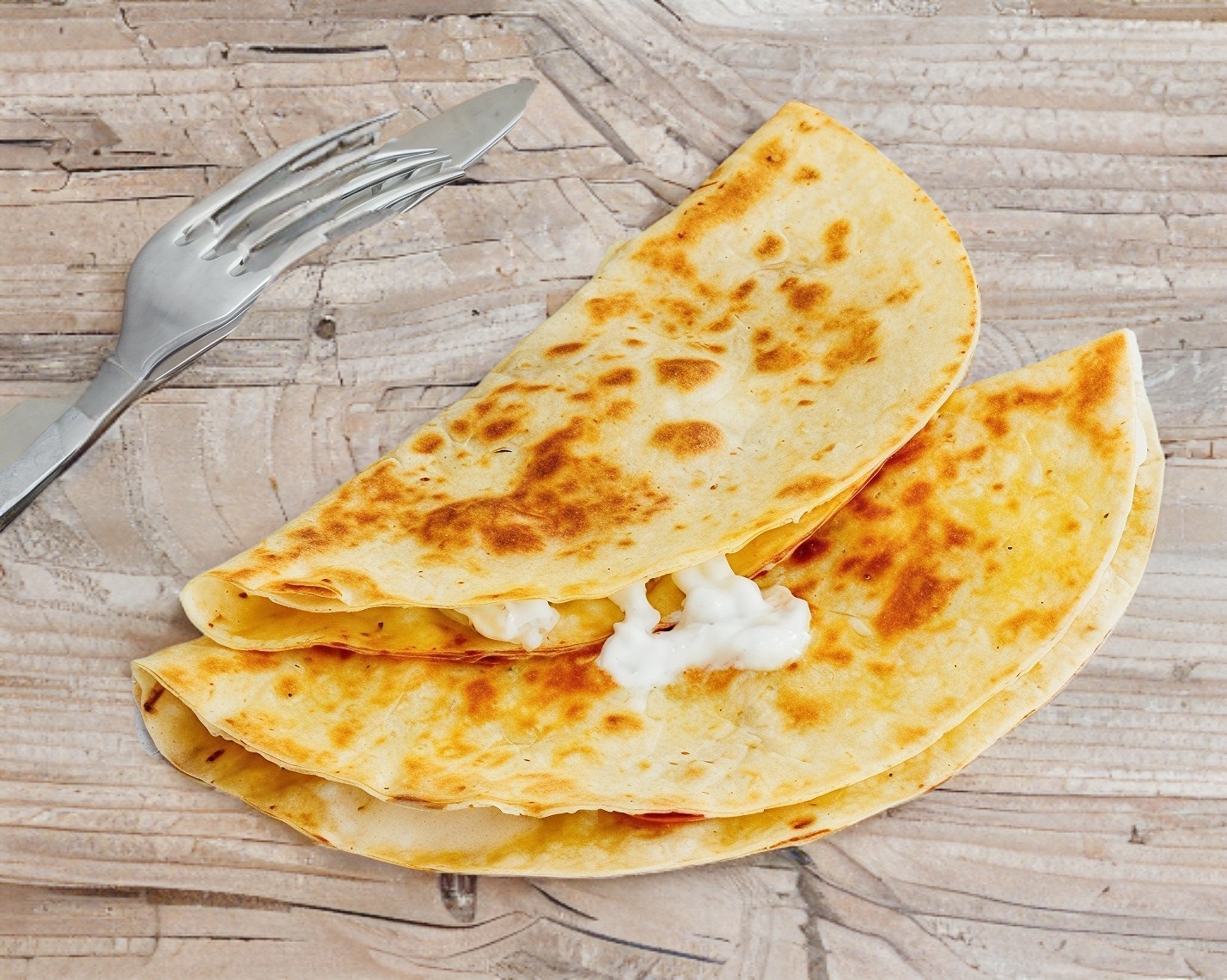 Doble tortilla de harina con queso Oaxaca derretido, verdura y salsa