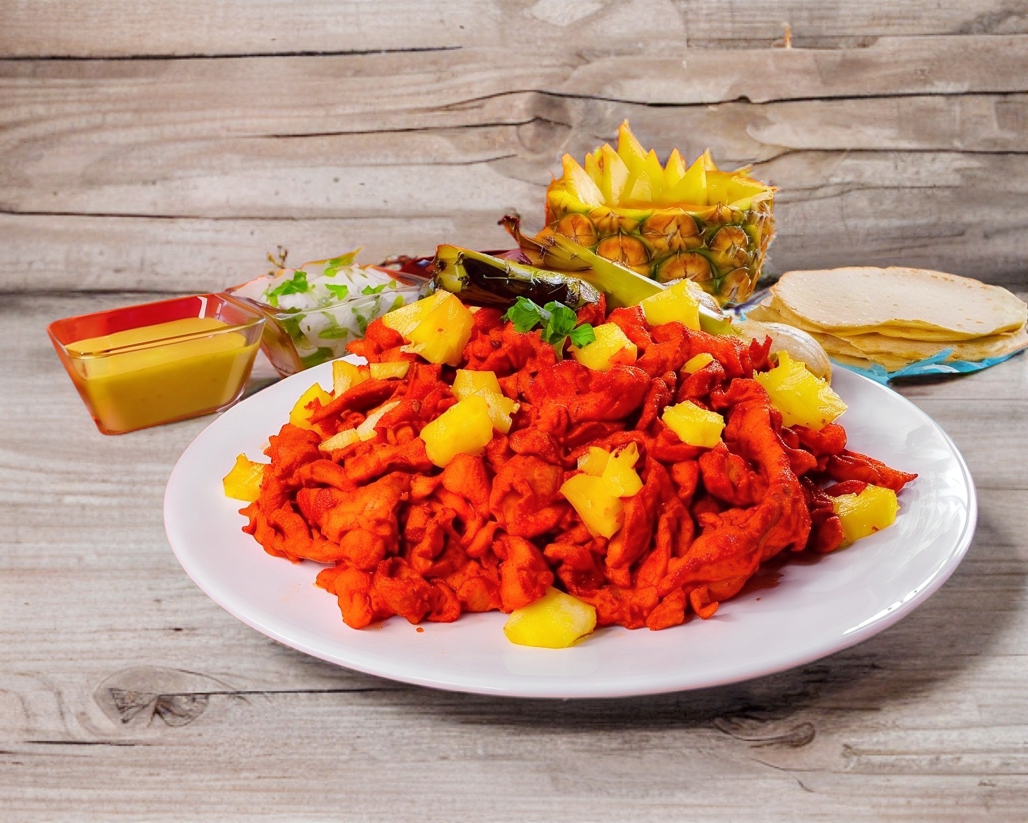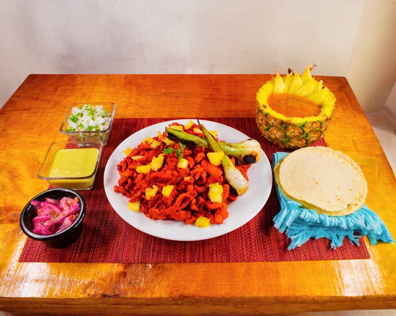 Incluye piña, tortillas, cebolla cambray, cilantro y salsa