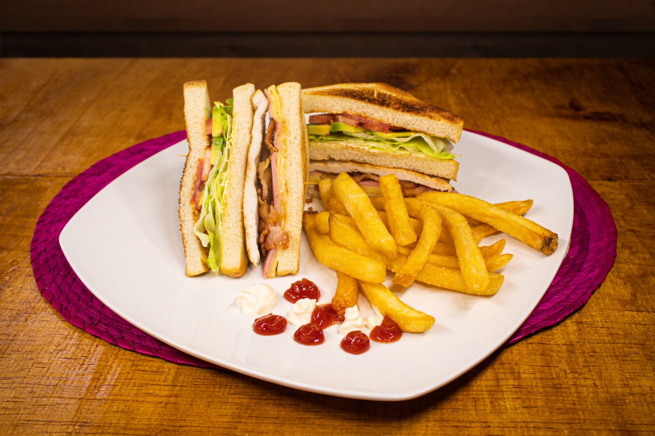 3 REBANADAS DE PAN CON MAYONESA, JAMON, QUESO, TOCINO, LECHUGA, CEBOLLA, JITOMATE, AGUACATE ACOMPAÑADO DE PAPAS A LA FRANCESA