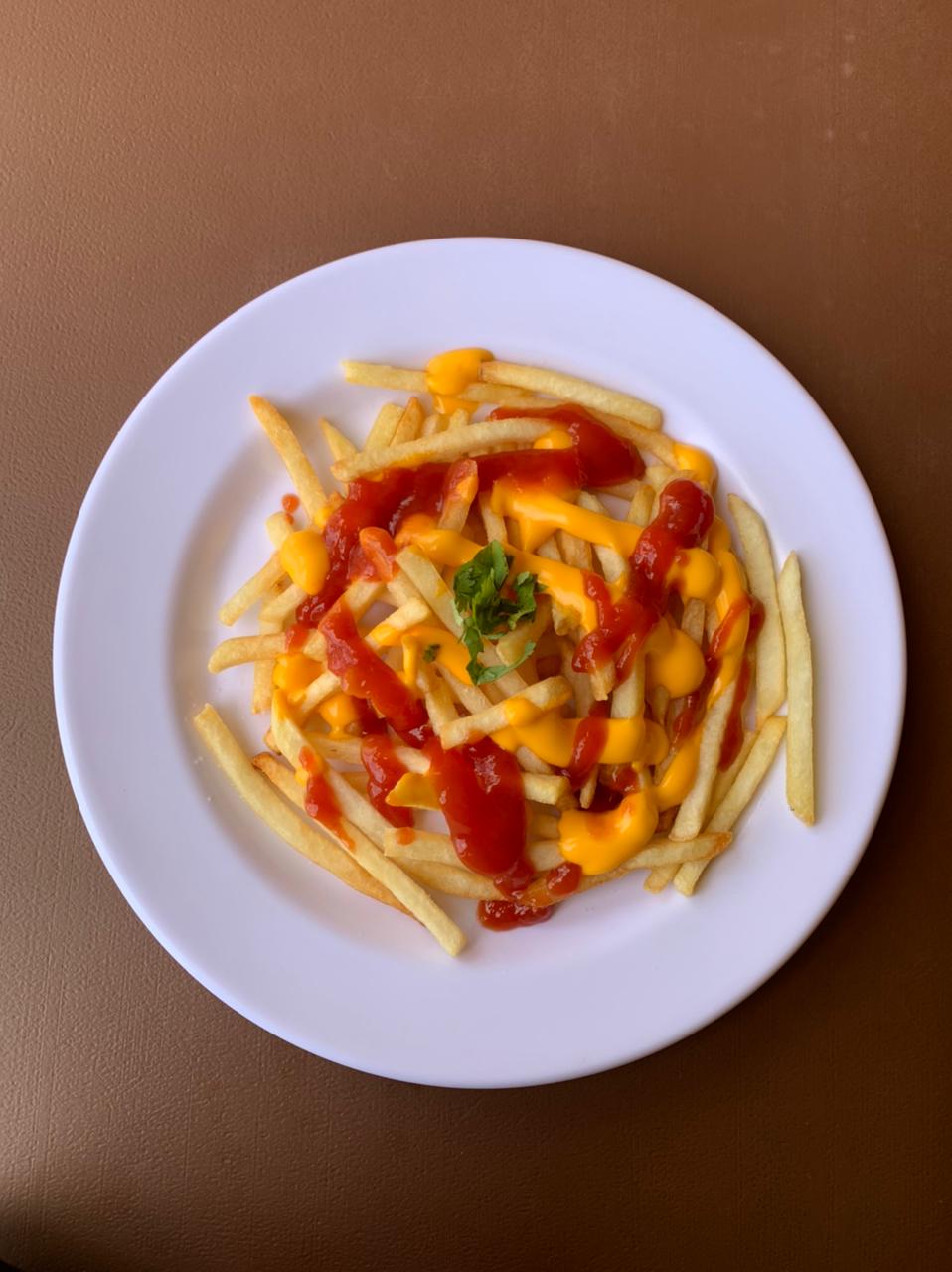 papas a la francesa acompañadas de queso cheddar