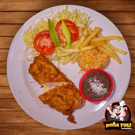 orden de pechuga de pollo empanizada acompañada de arroz, frijol y ensalada incluye salsas y tortillas.