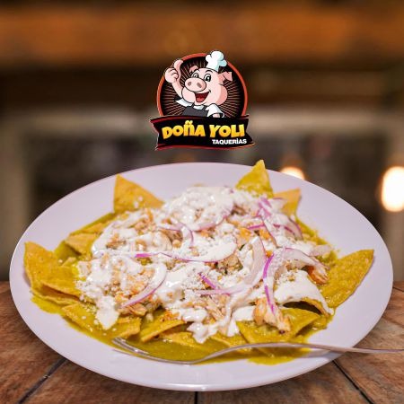 TOTOPOS BAÑADOS EN SALSA VERDE ACOMPAÑADOS DE CREMA, QUESO, CEBOLLA, CILANTRO Y POLLO