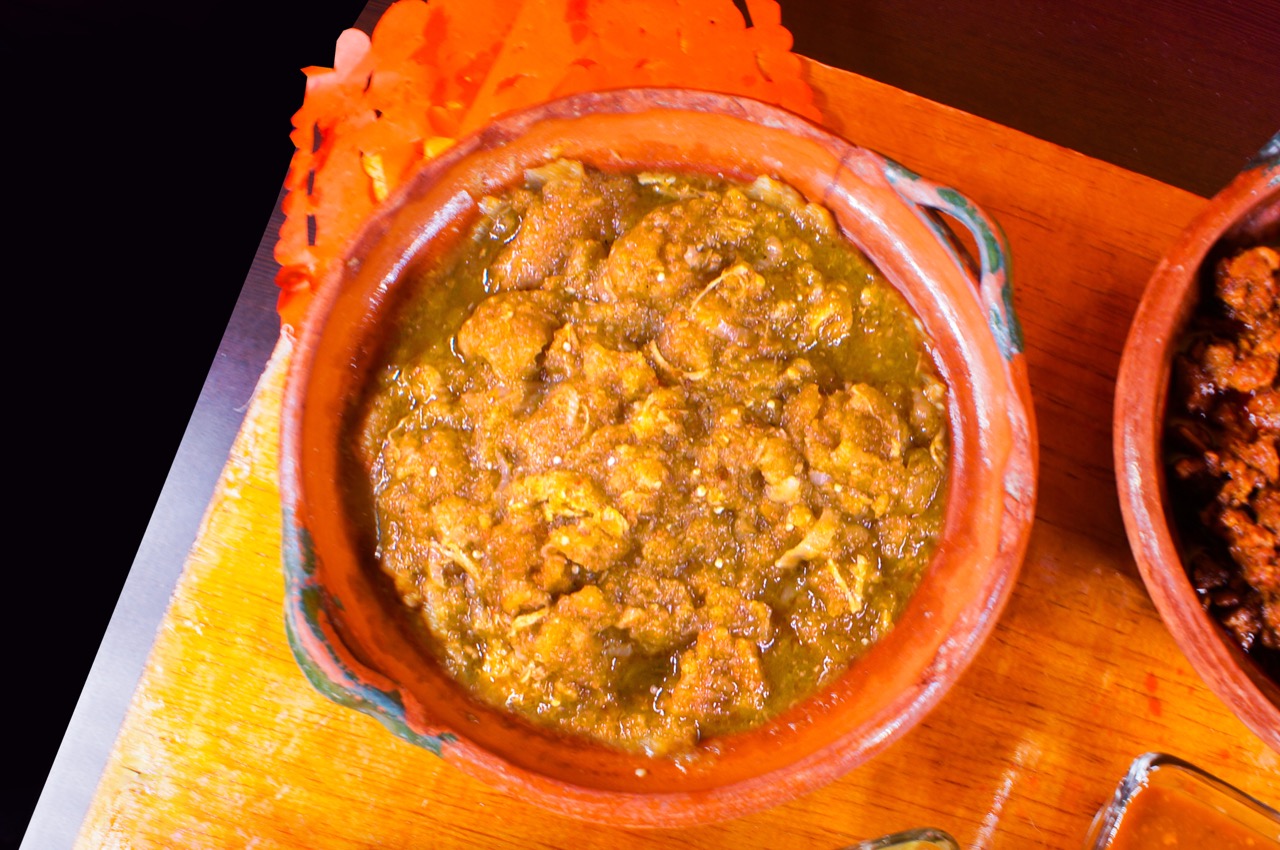 TOTOPOS BAÑADOS EN SALSA VERDE ACOMPAÑADOS DE BISTEC DE RES, CREMA, QUESO, CILANTRO Y CEBOLLA