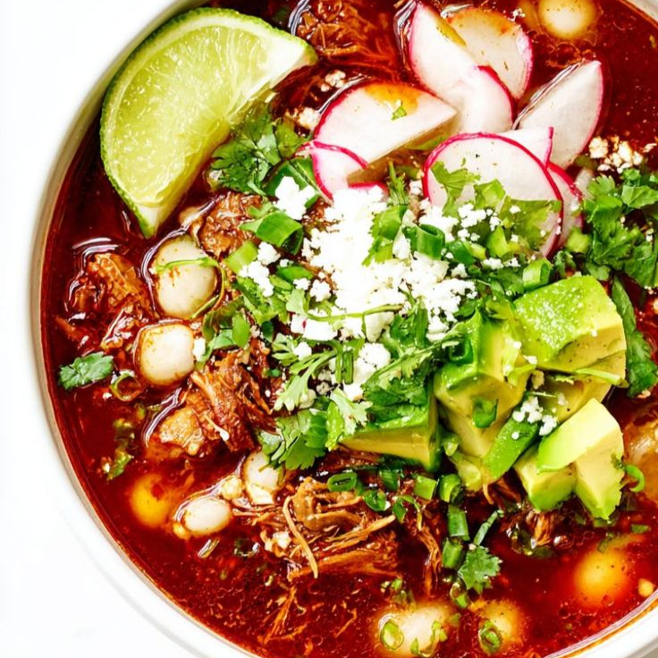 Delicioso tradicional pozole rojo, con carne de puerco. Incluye: lechuga, cebolla blanca picada, aguacate, limon, chile y orégan en polvo, totopos y chicharrón crujiente