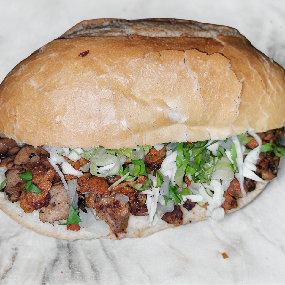 Pan bolillo ,carne de pastor,col blanca, lechuga ,cebolla ,cilantro,piña.Complementos y salsas aparte.
