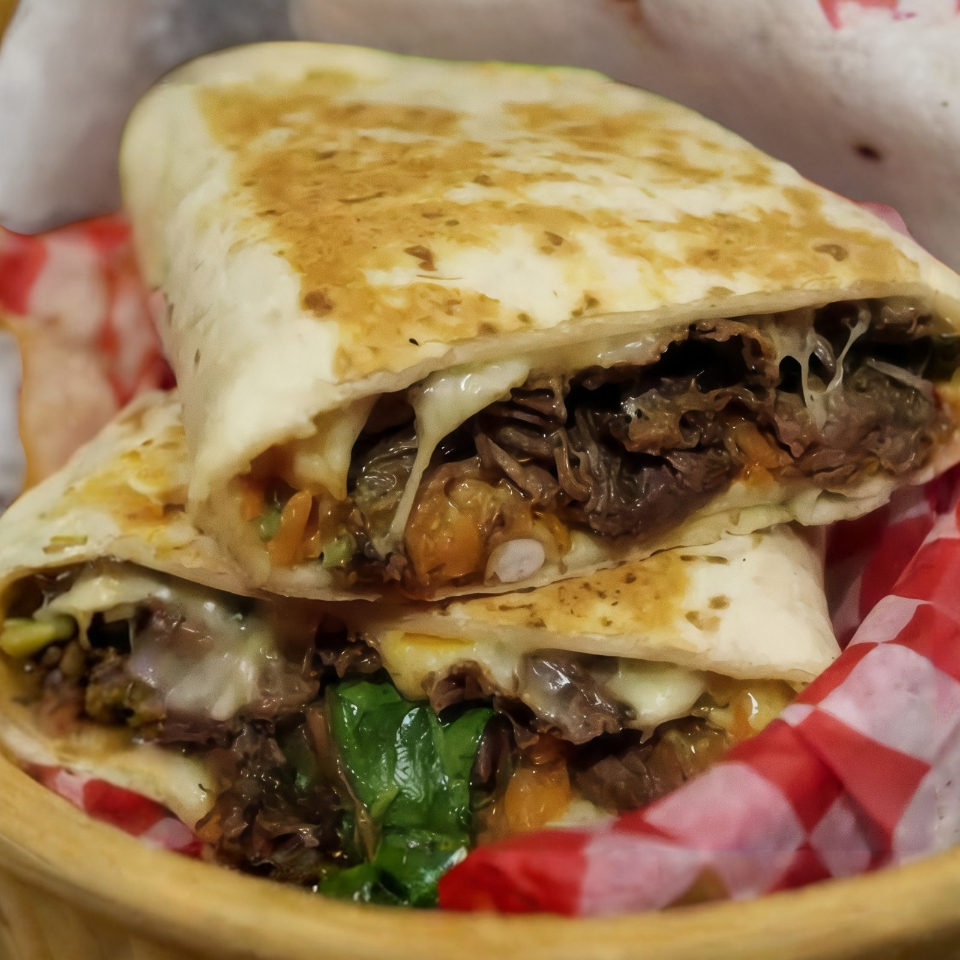 Tortilla de harina rellena,carne de pasto con queso ,col blanca ,lechuga ,cebolla,cilantro y Pina. Complementos y salsas aparte.
