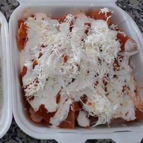 Totopos de maíz bañados en salsa de tomate, cubiertos de queso rallado ,crema ,cebolla,carne de puerco y cilantro.