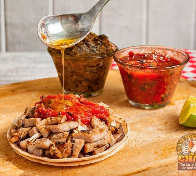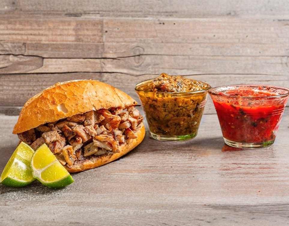 Bolillo calentado a la brasa relleno con carne asada estilo poc chuc y chorizo Argentino; embarrado de frijoles refritos y mayonesa con un toque de repollo y cilantro.