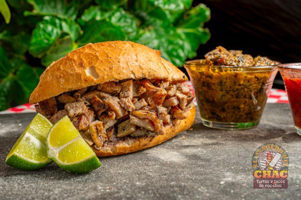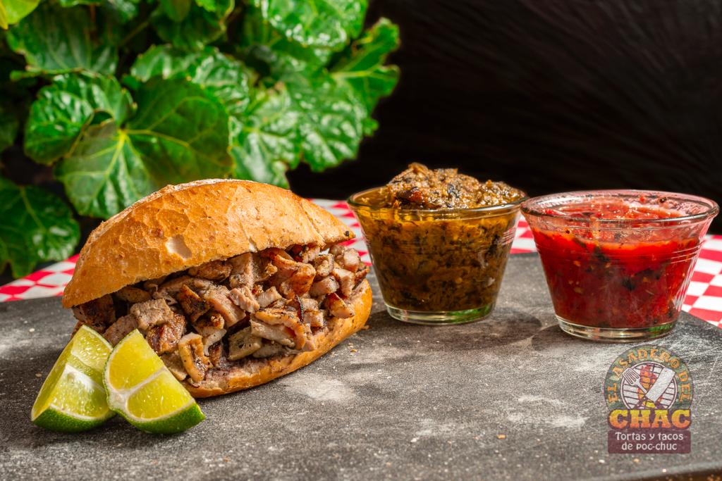 Bolillo calentado a la brasa relleno con carne asada estilo poc chuc y longaniza de Valladolid; embarrado de frijoles refritos y mayonesa con un toque de repollo y cilantro.