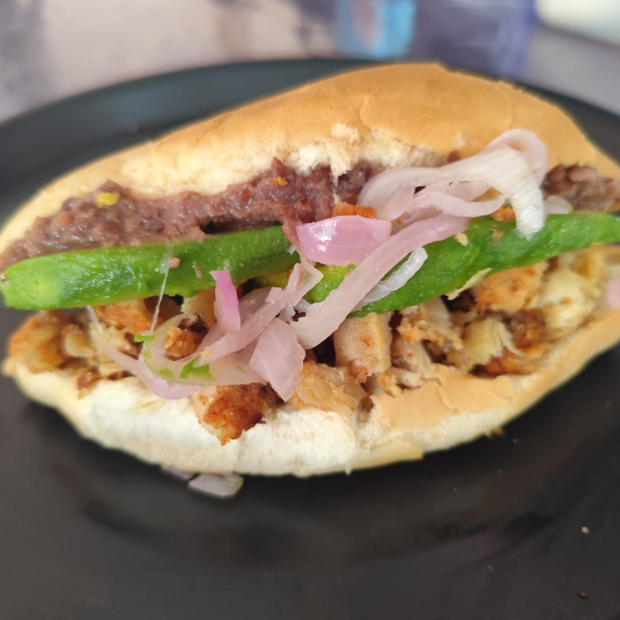 PECHUGA DE POLLO, PAN MOLIDO, MAYONESA, FRIJOL, AGUACATE, CEBOLLA MORADA Y SALSA