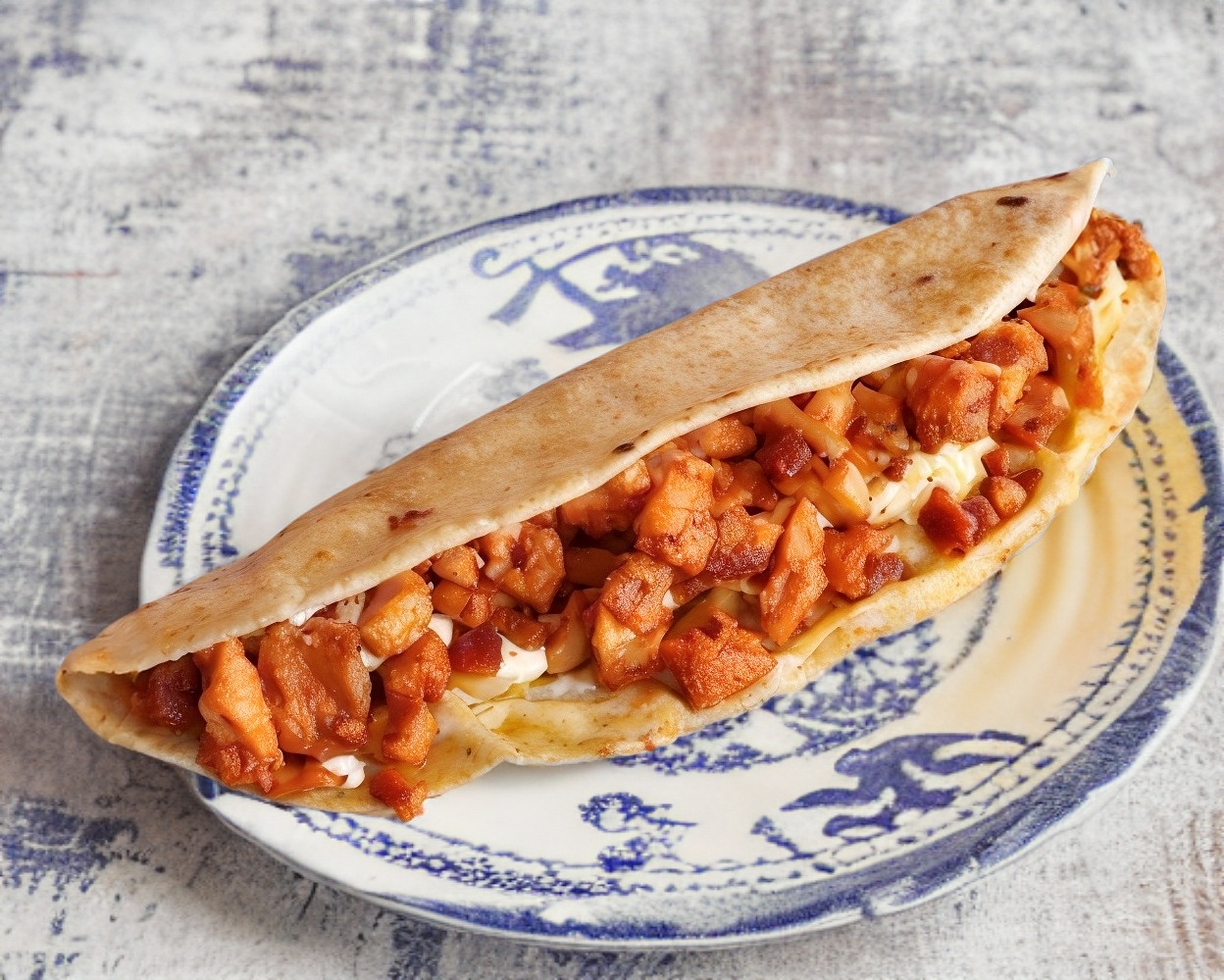 Una empanada de tinga de pollo con lechuga, crema y queso.