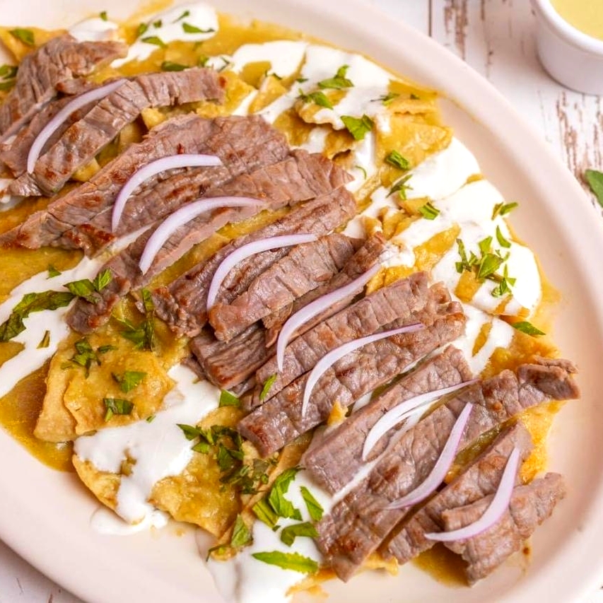 Chilaquiles verdes o rojos con cecina, crema, queso y cebolla.