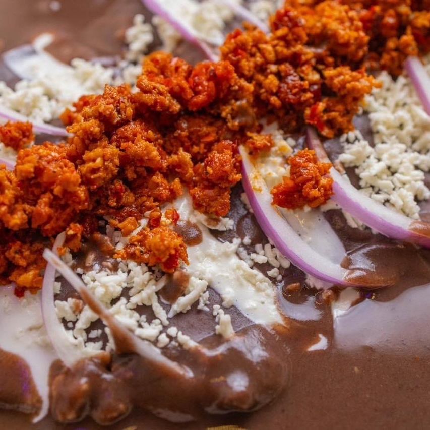 Base salsa guajillo, frijol, crema, queso y cebolla.