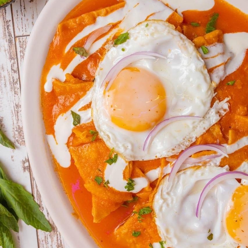 Chilaquiles rojos o verdes con 2 huevos, crema, queso y cebolla.