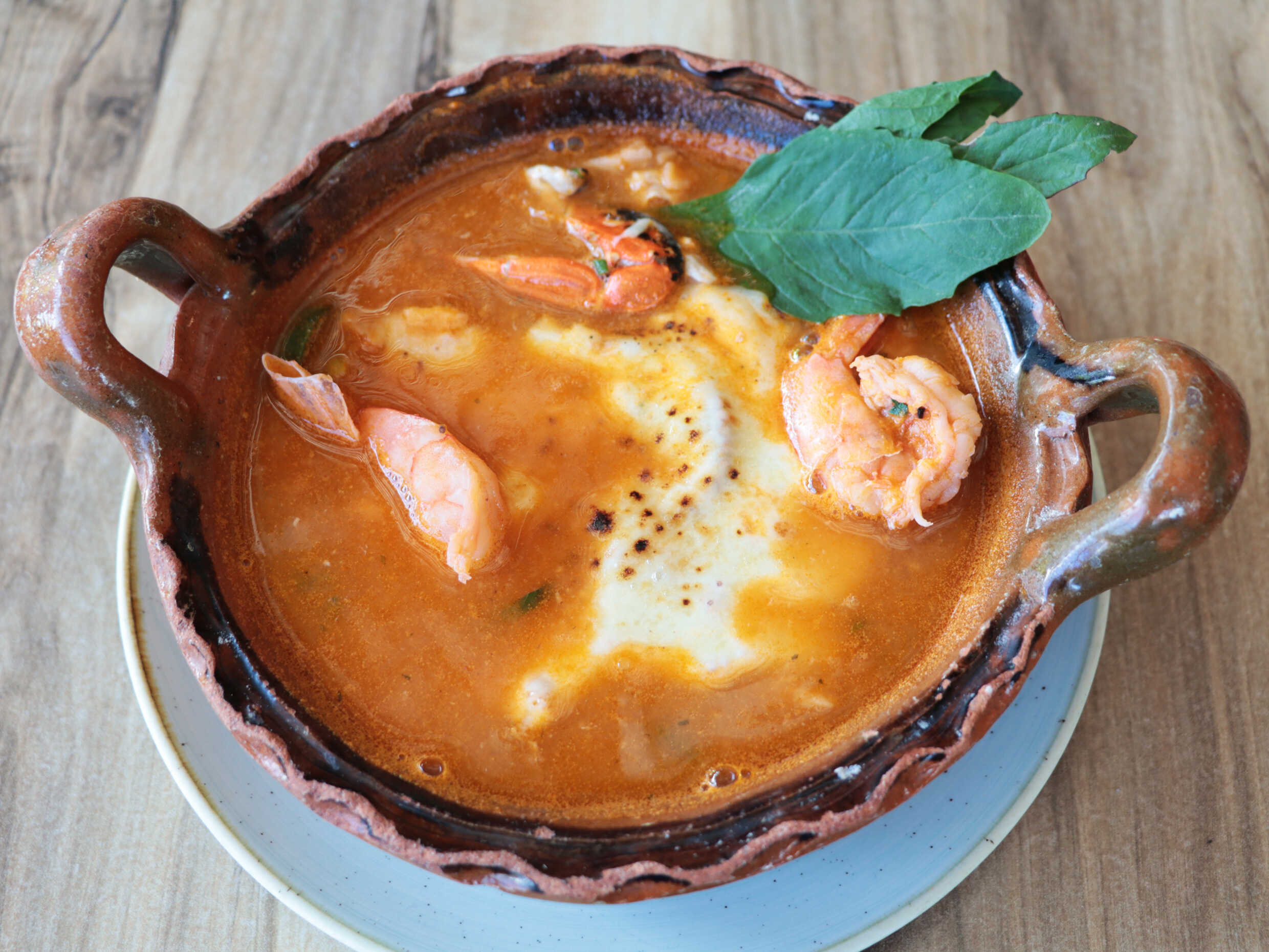 Caldoso, con jaiba, pulpo, camarón y pescado.