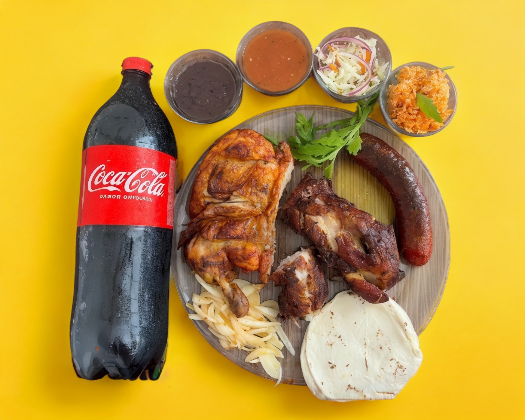 1 Pollo rostizado, 1/4 de kilo costilla, 1 pieza d chorizo, 1/2 de tortillas, 1 refresco Coca Cola 1.35 L. Todos nuestros paquetes incluyen arroz, salsa, frijol.