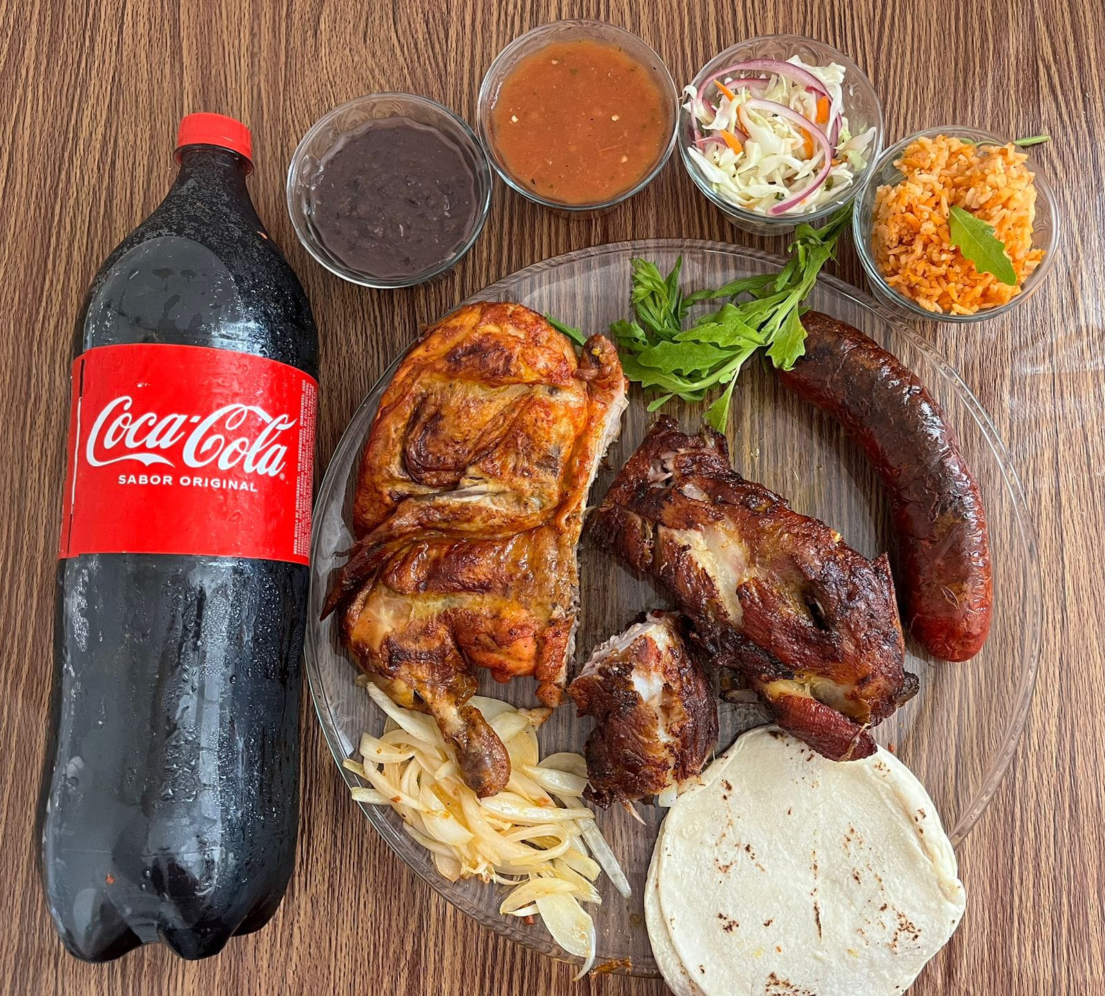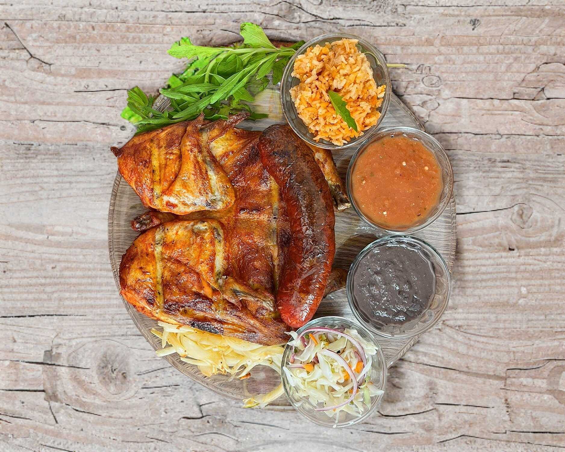 Pollo entero, 1/2 de tortillas, 1 pieza de chorizo, 1 refresco Coca Cola 2.5 L, todos nuestros paquetes incluyen arroz, salsa, frijol .