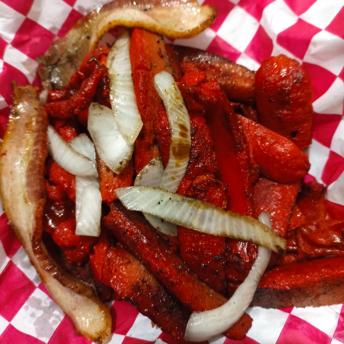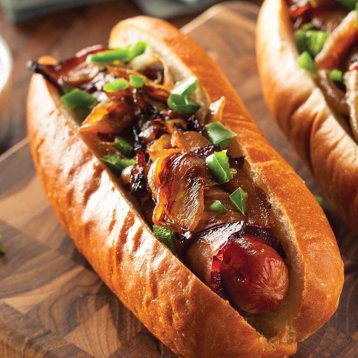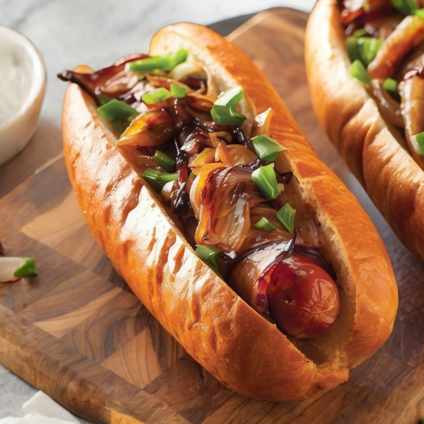 Orden de salchichas con cebollas caramelizadas.