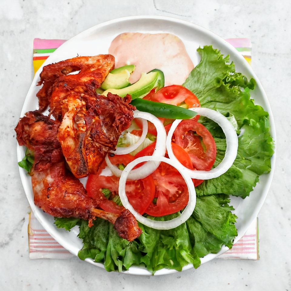Pollo frito marinado, acompañado de ensalada y papas a la francesa. (Si pagas en efectivo e enviamos guarniciones extra o salchichas)