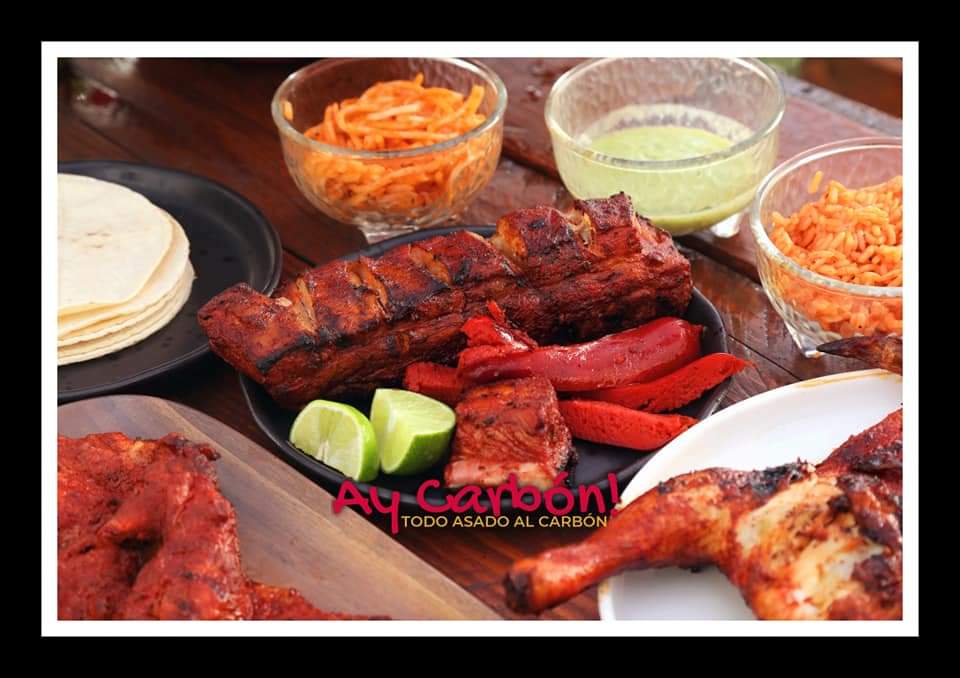 Costillas asadas al carbón, arroz, pasta, salsas, tortillas (si pagas en efectivo te enviamos guarniciones extra o salchichas o cebolla)
